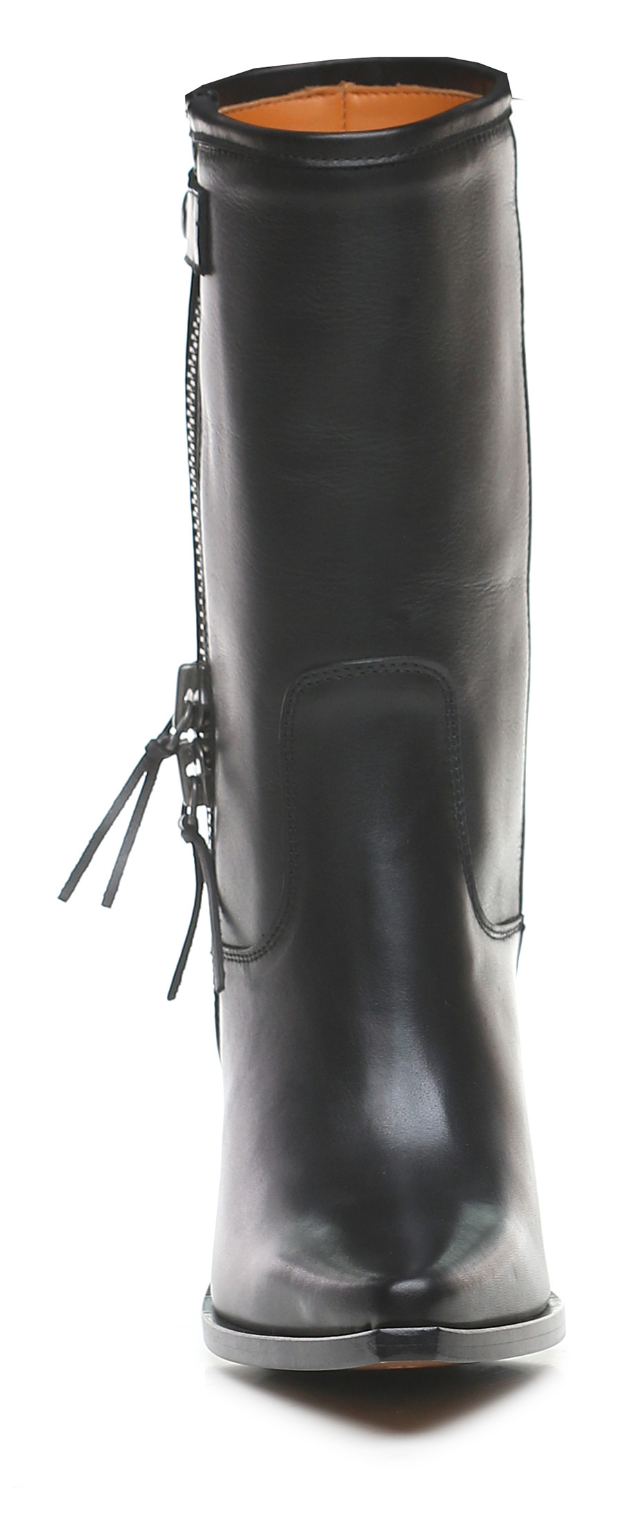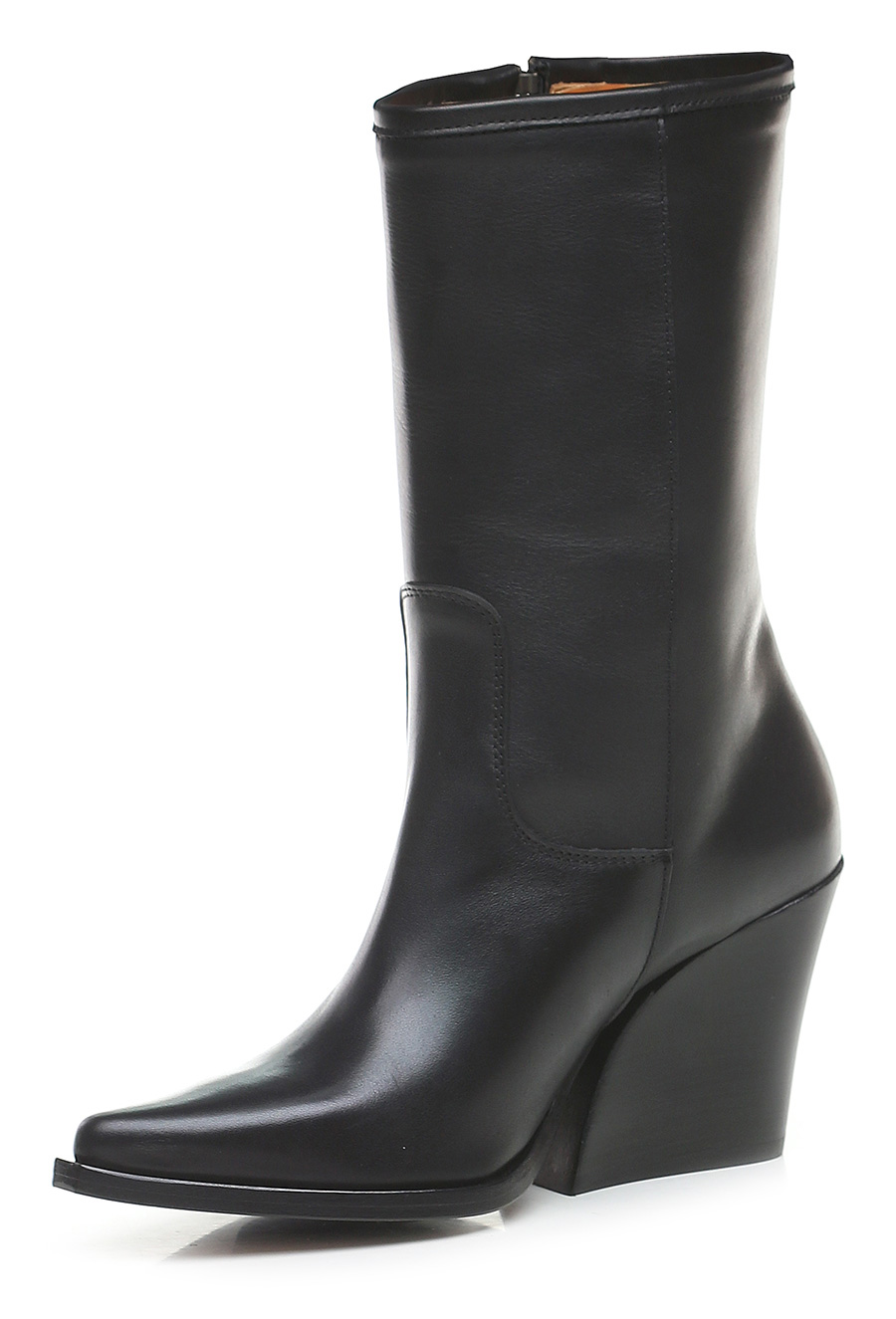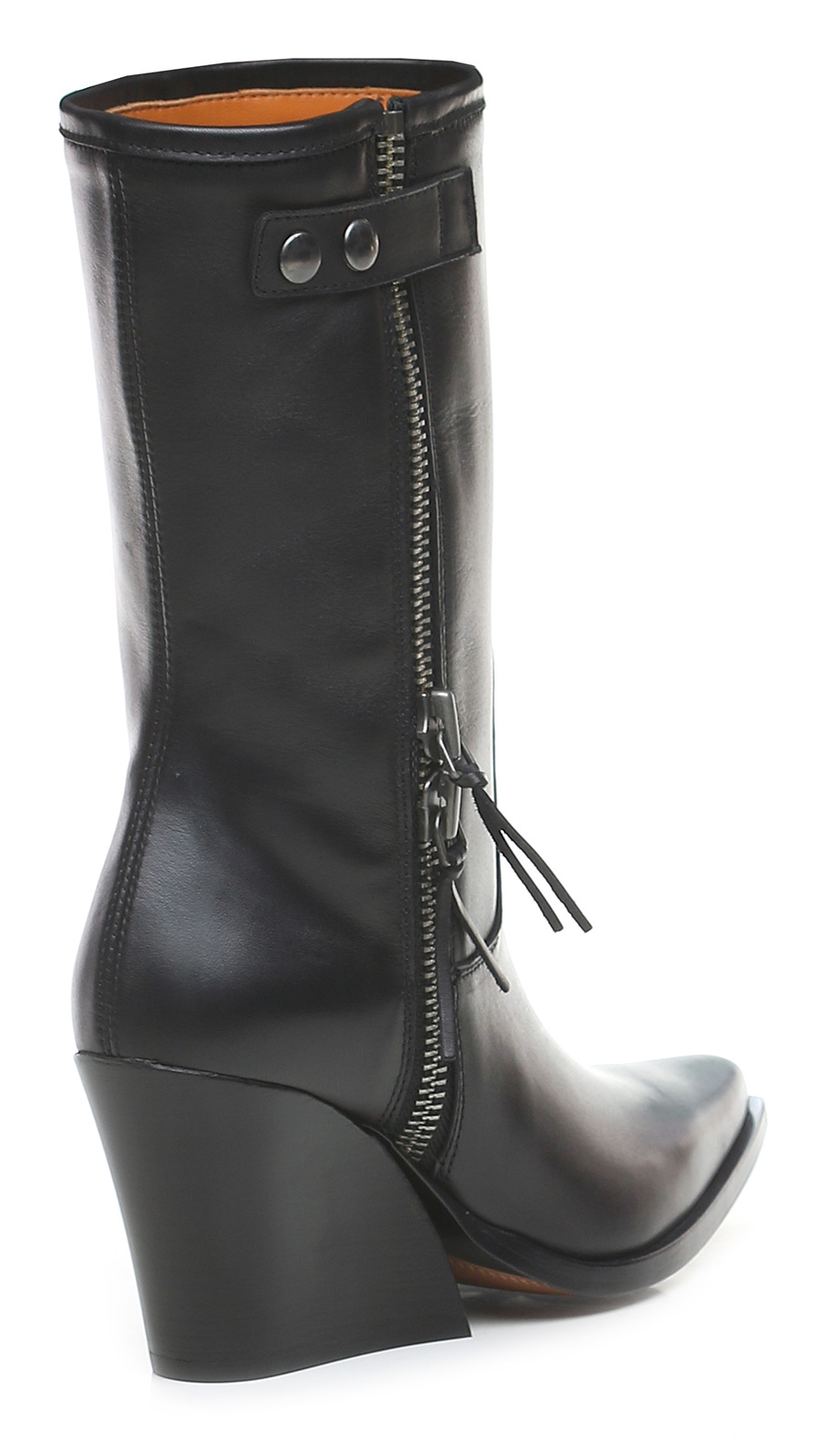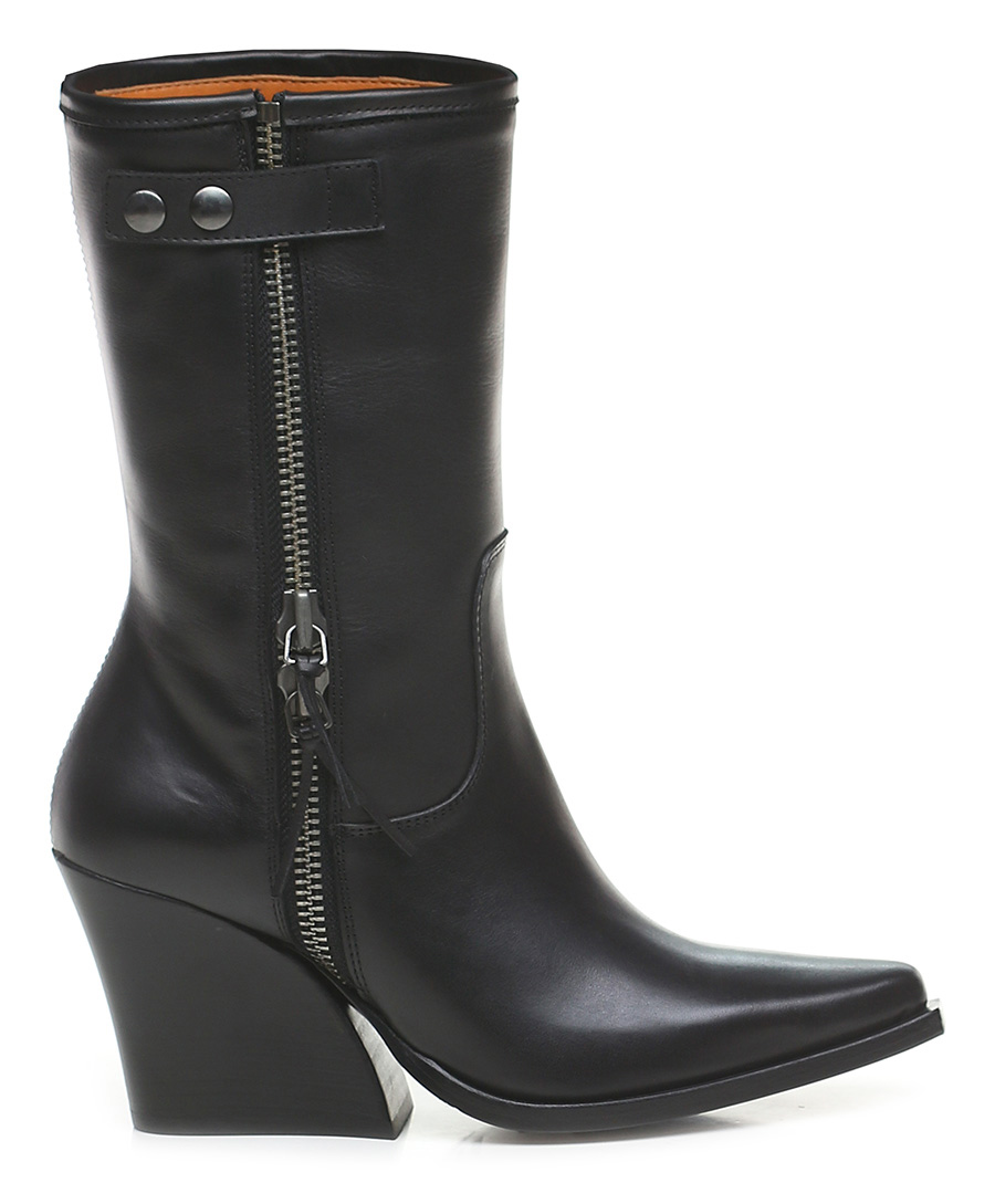 Leather ankle boot with double side zip and leather and rubber sole. Heel height 80mm. Wood effect heel.