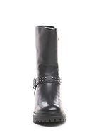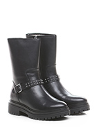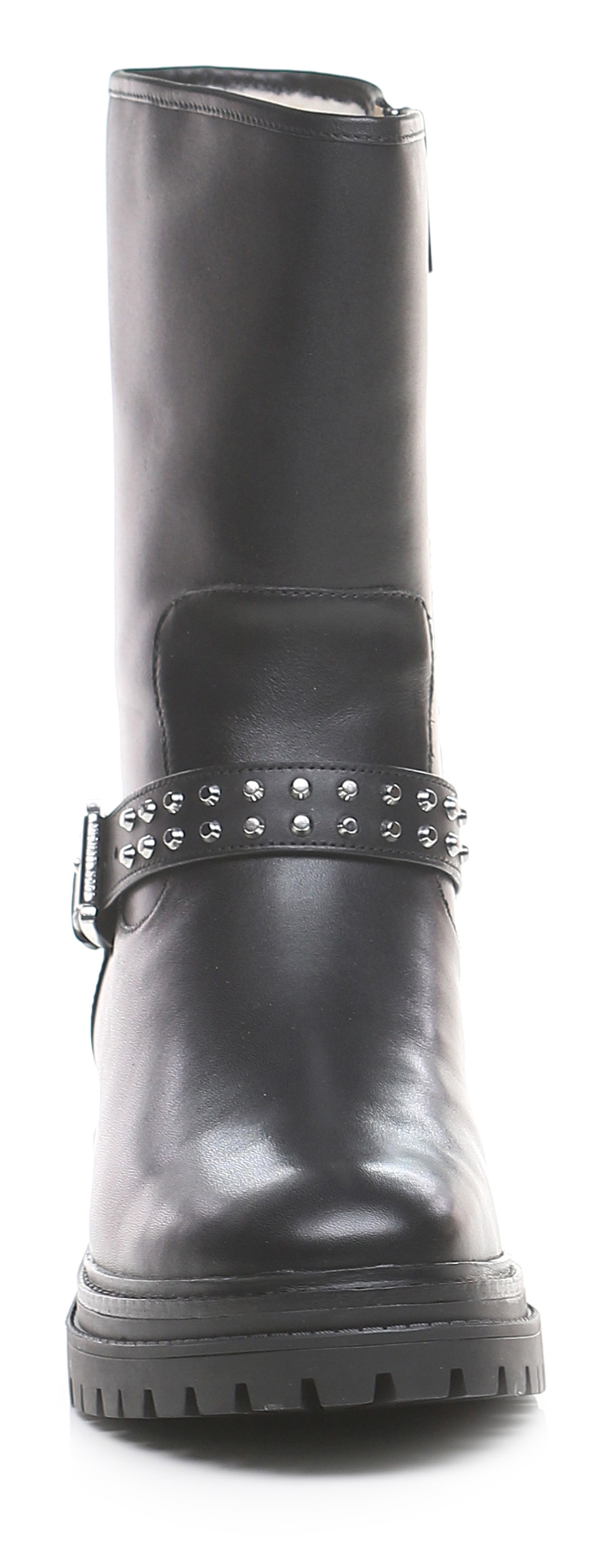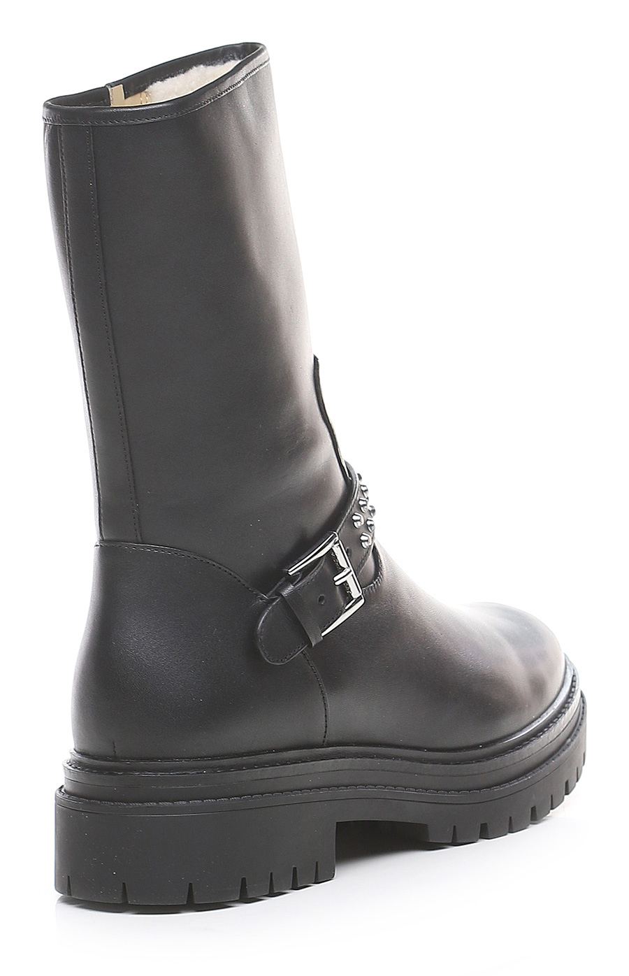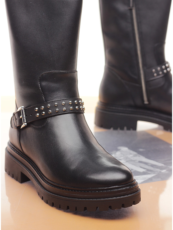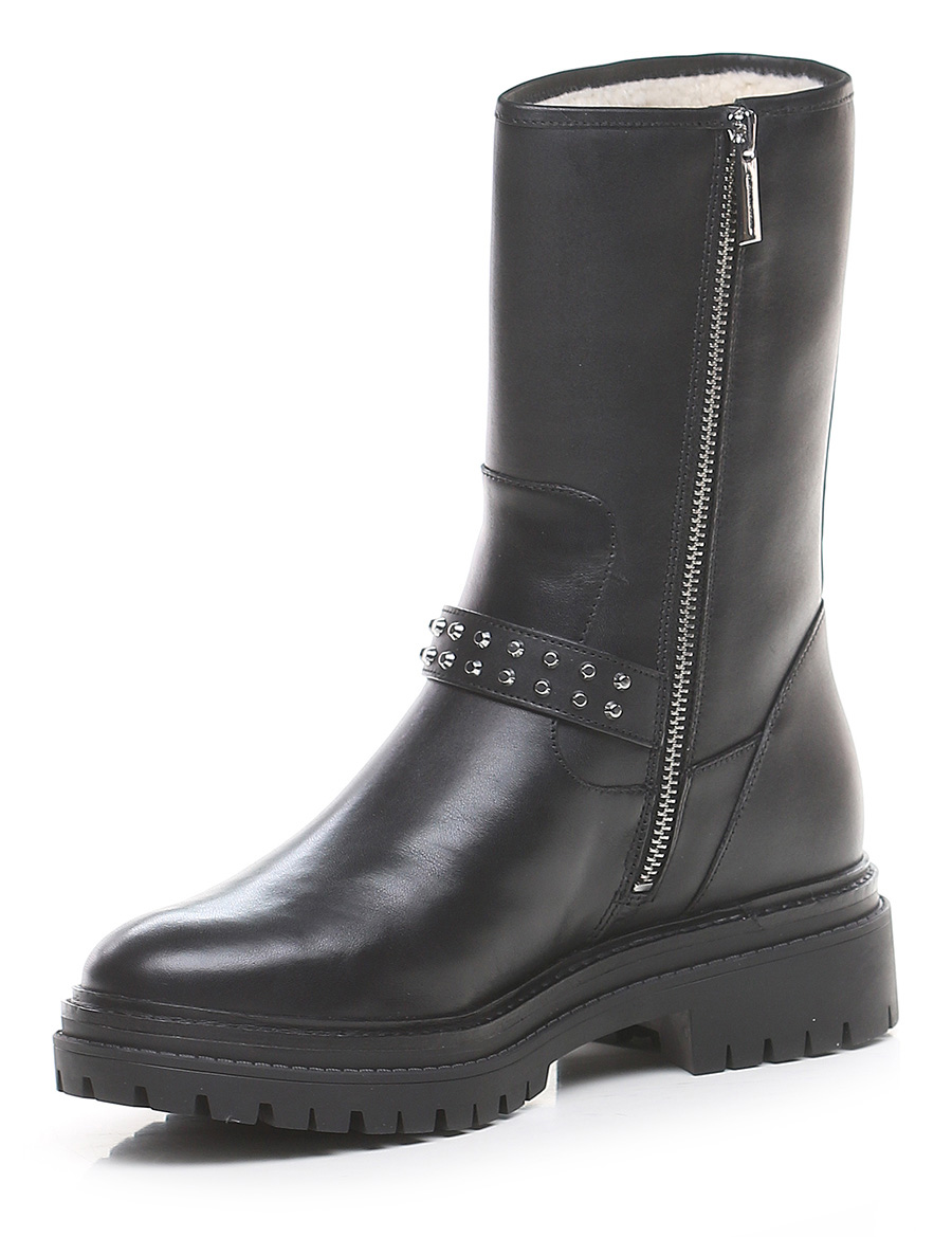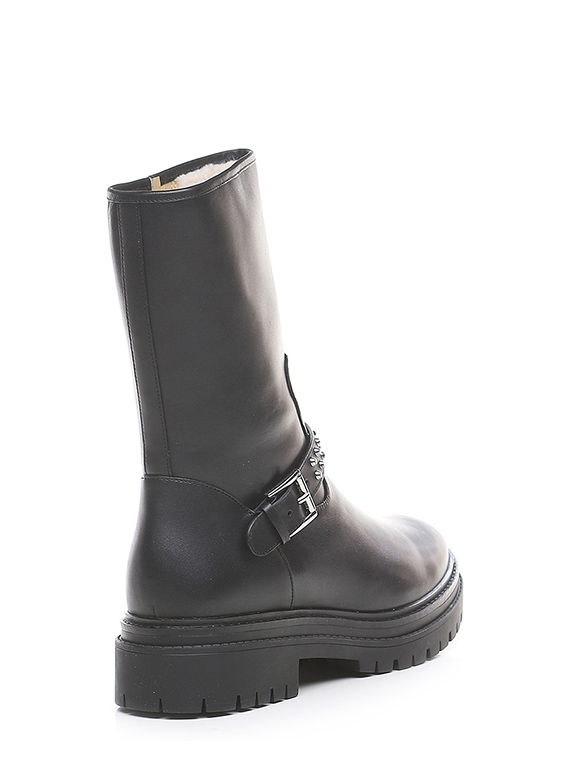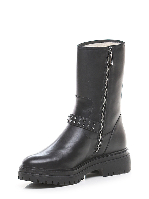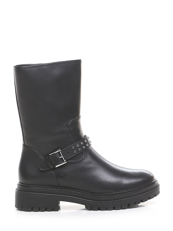 Leather ankle boot with side zip and strap with studs. Rubber sole. 45mm heel height, 30mm platform with 15mm ledge.