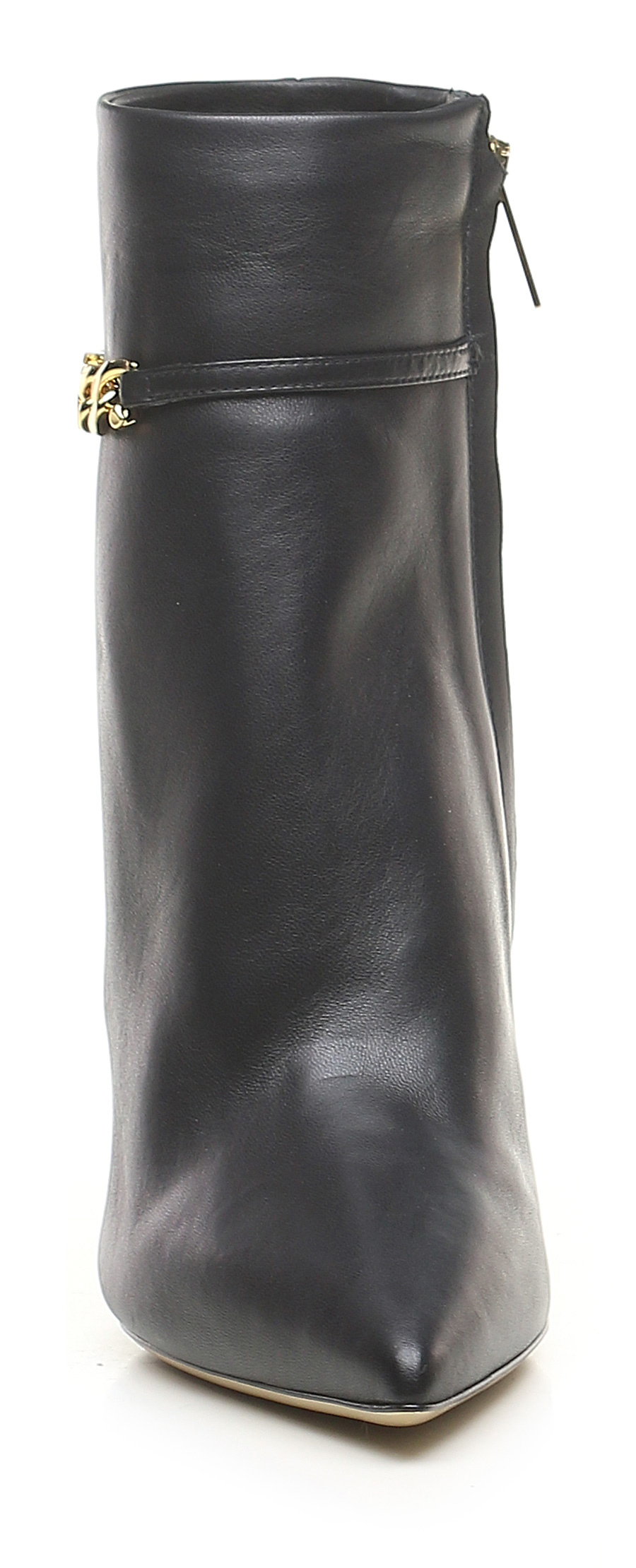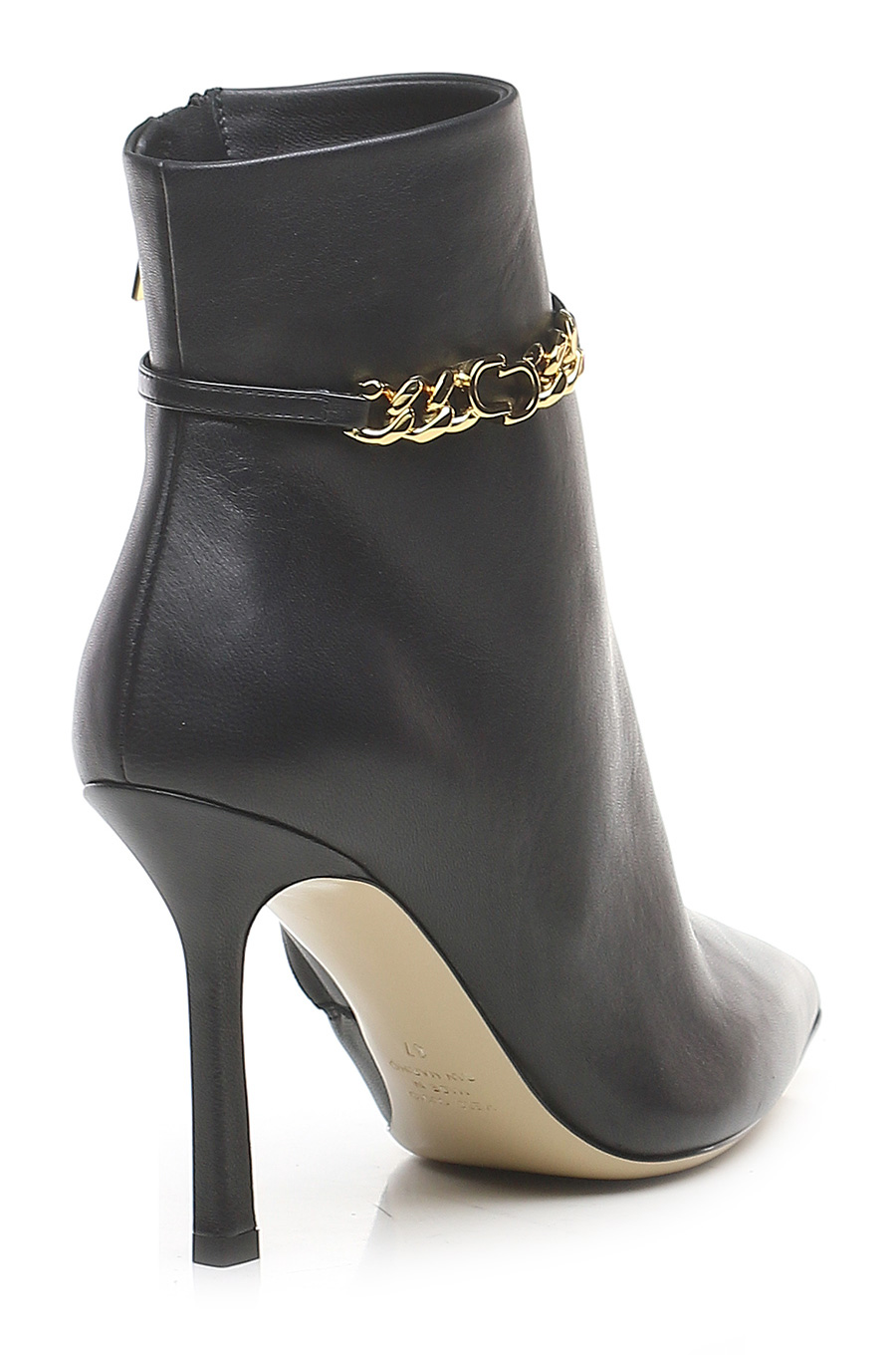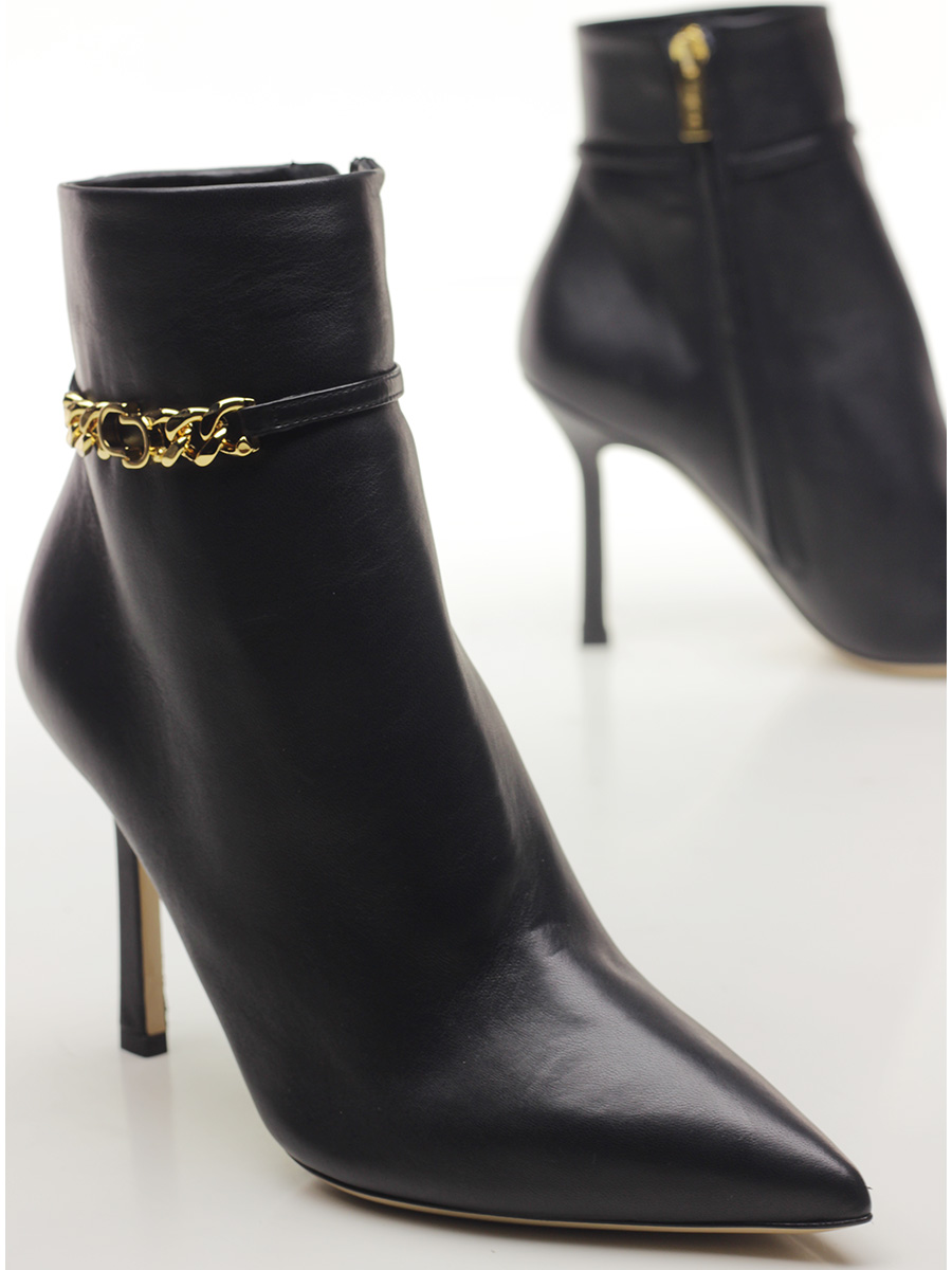 Leather ankle boot with side zip and chain accessory. Leather sole. Heel height 95mm.