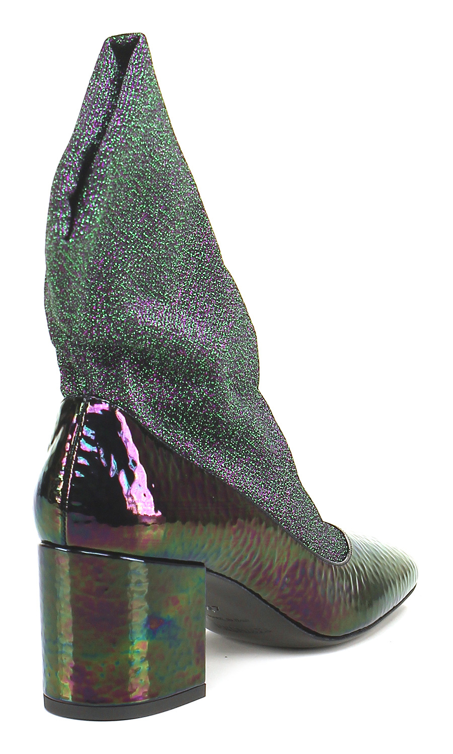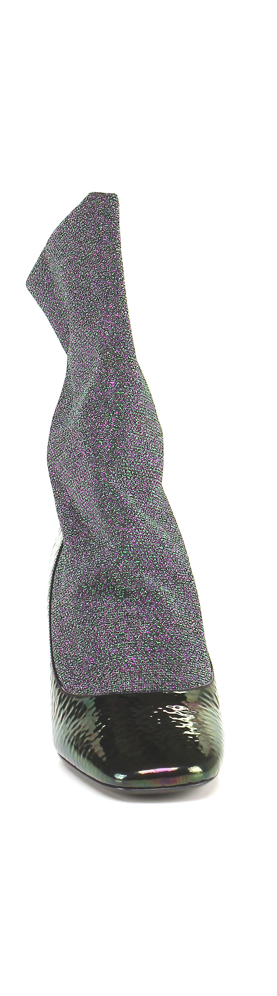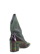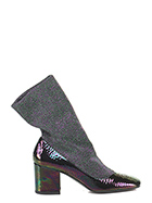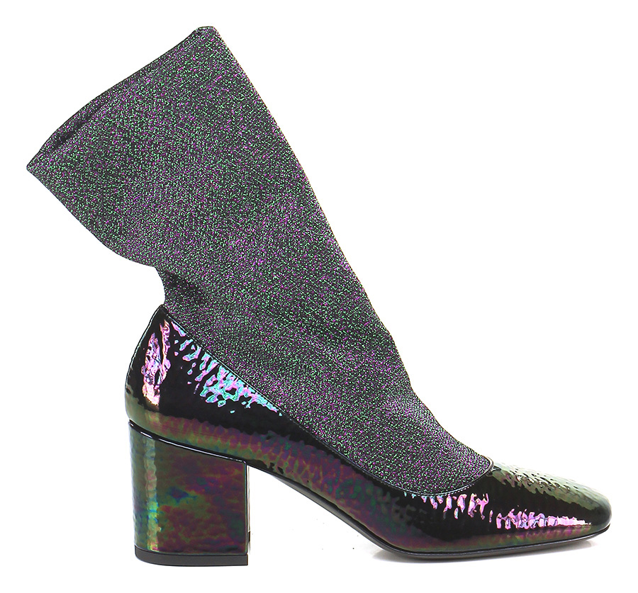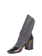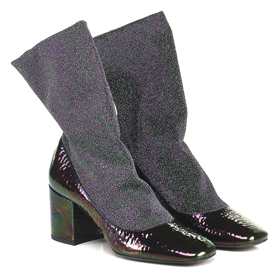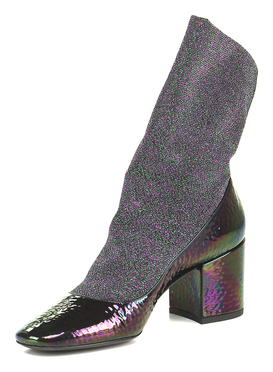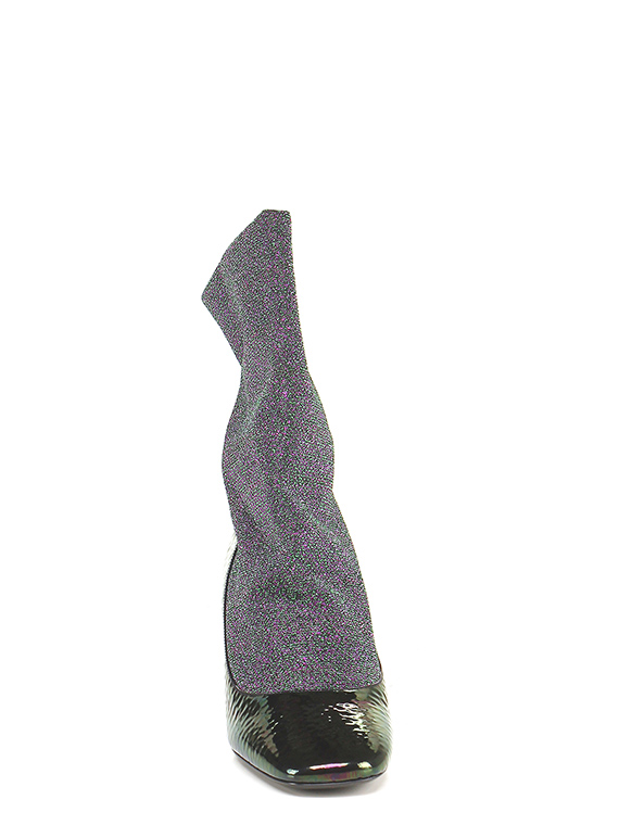 Ankle boot in hammered effect patent leather and lurex fabric with elasticated leg and leather and rubber sole. Heel 70.