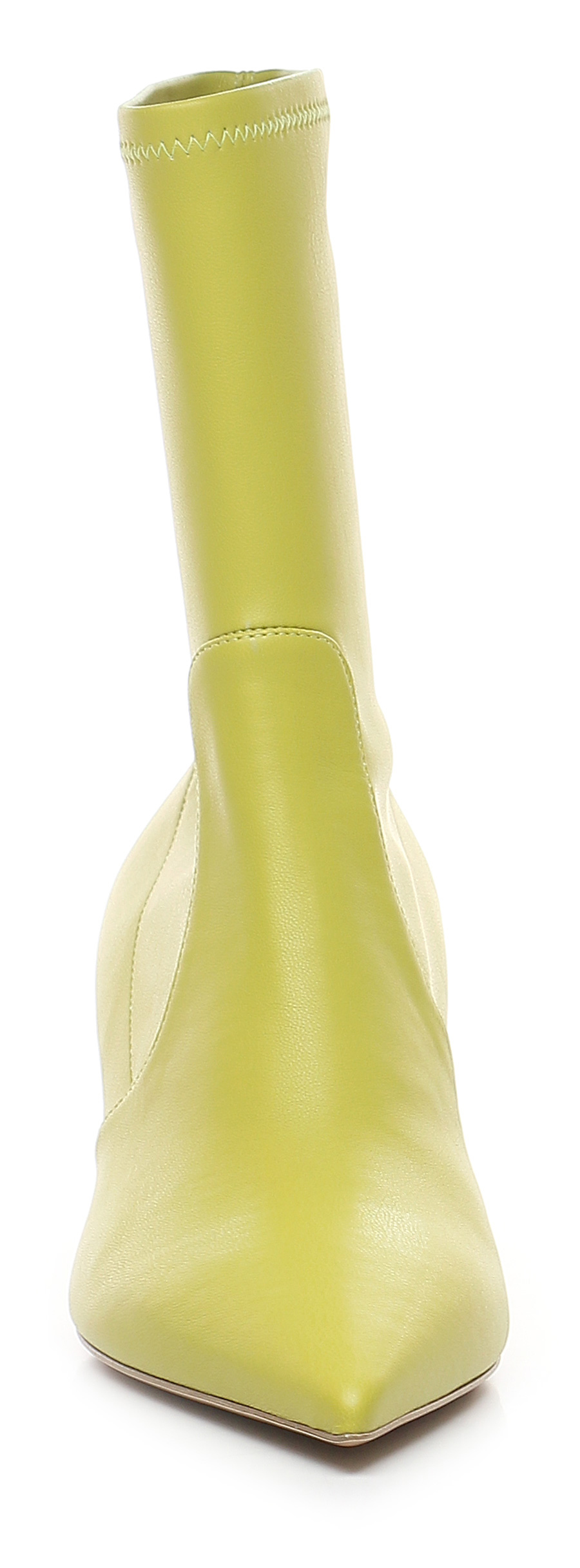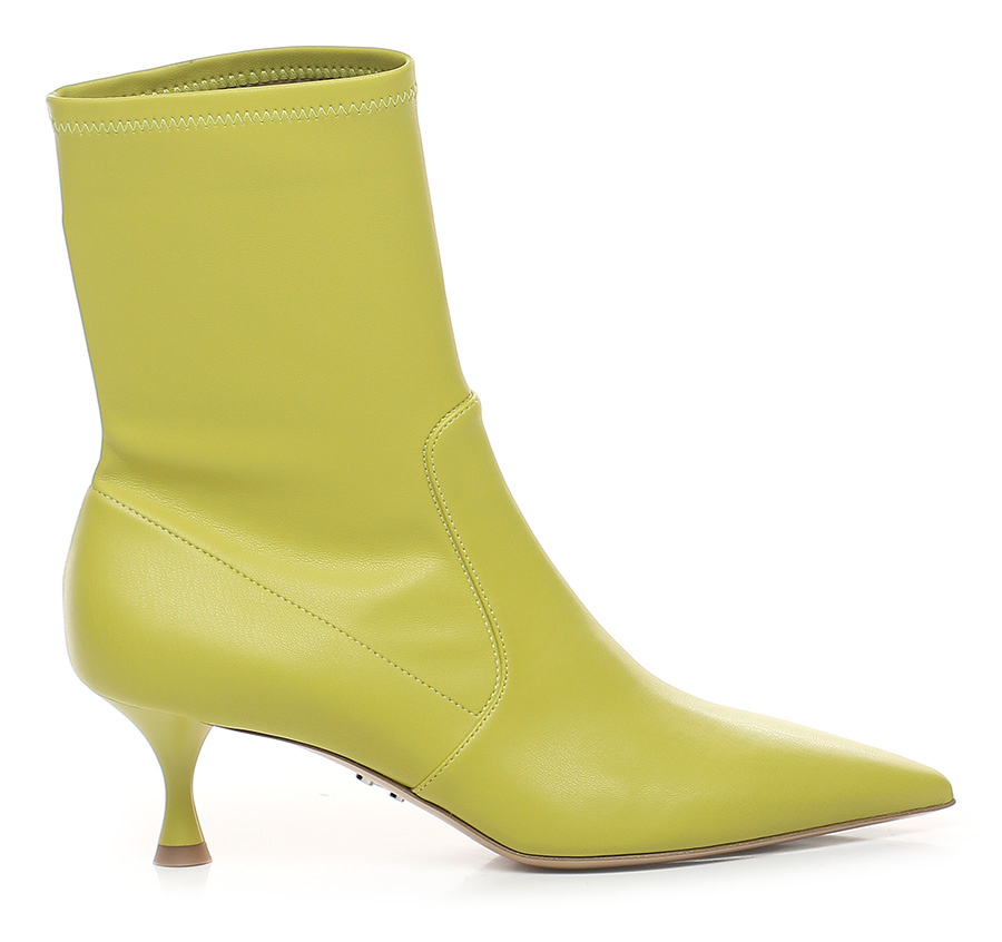 Faux leather ankle boot with stretch leatherette upper. Leather sole. Heel height 55mm. Spool heel in opaque effect PVC.