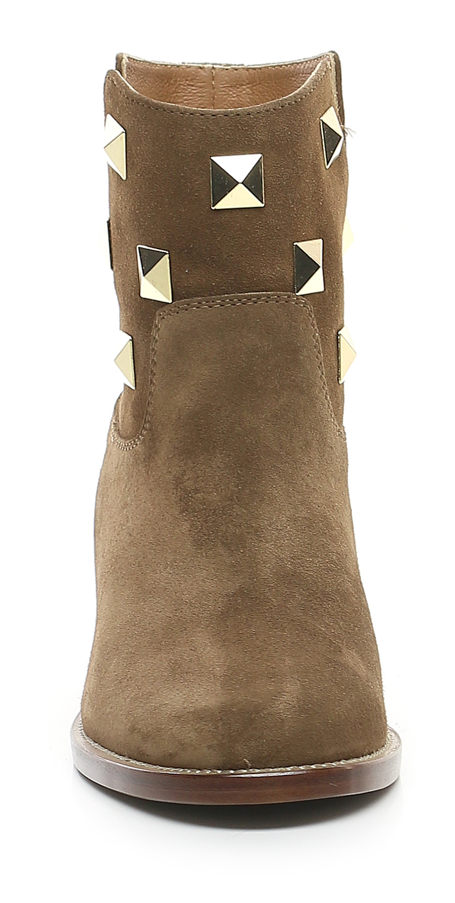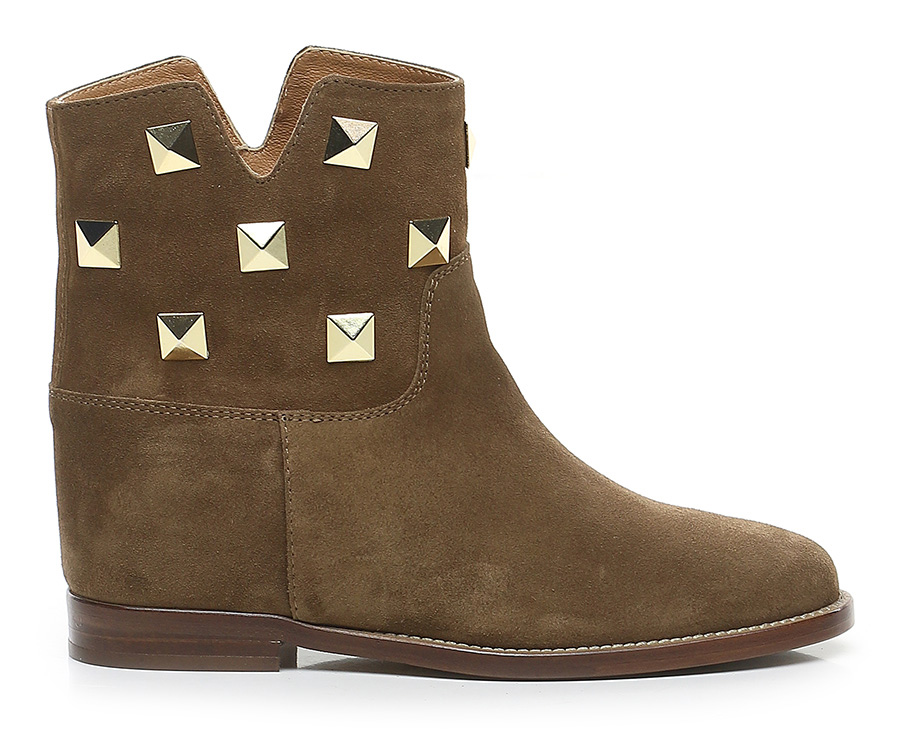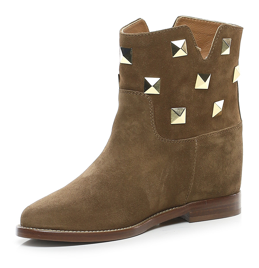 Suede ankle boot with gold studs on the upper. Leather and rubber sole. Heel height 20mm. Internal wedge of 40mm.