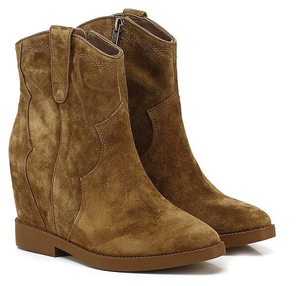 Tronchetto in camoscio effetto vintage con zip su lato interno e zeppa interna. Suola in gomma, tacco 30, platform 15 con battuta 15.