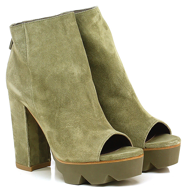 Tronchetto in camoscio con zip su retro e suola in gomma. Tacco 115, platform 30 con battuta 85.
