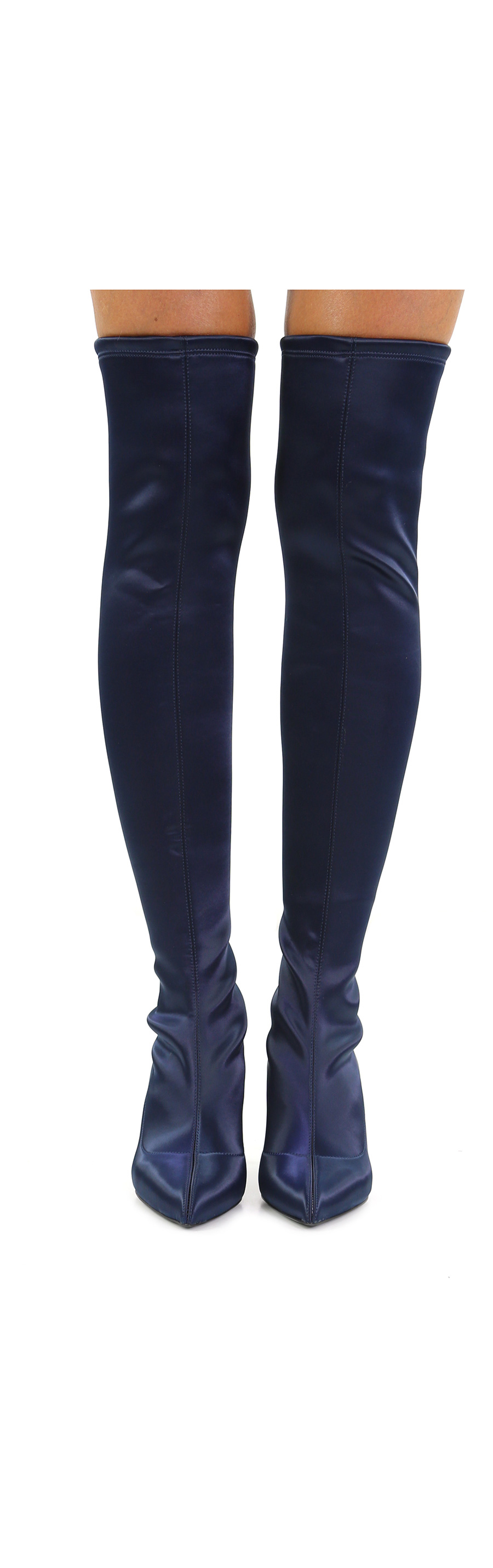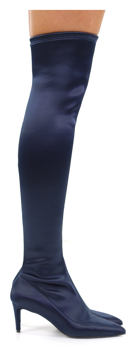 Fabric boot with elasticated leg and leather sole. Heel 70, platform 15 with ledge 45. Leg height 550.