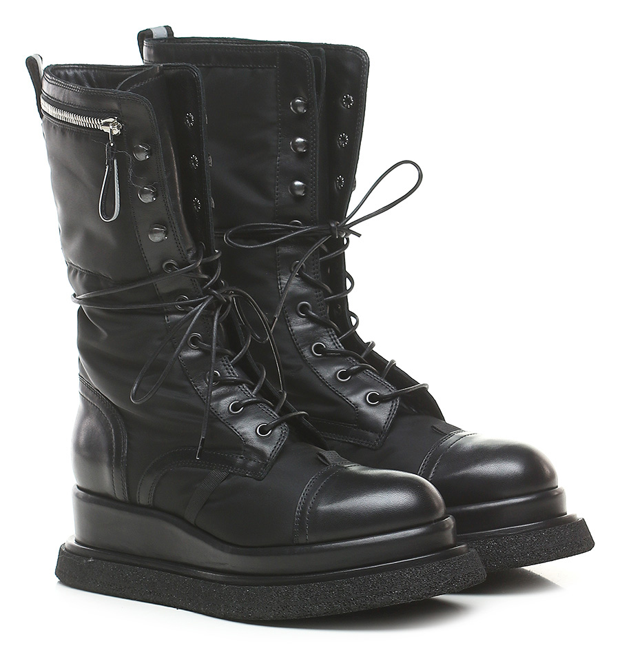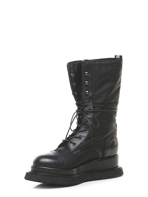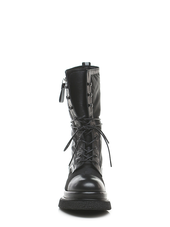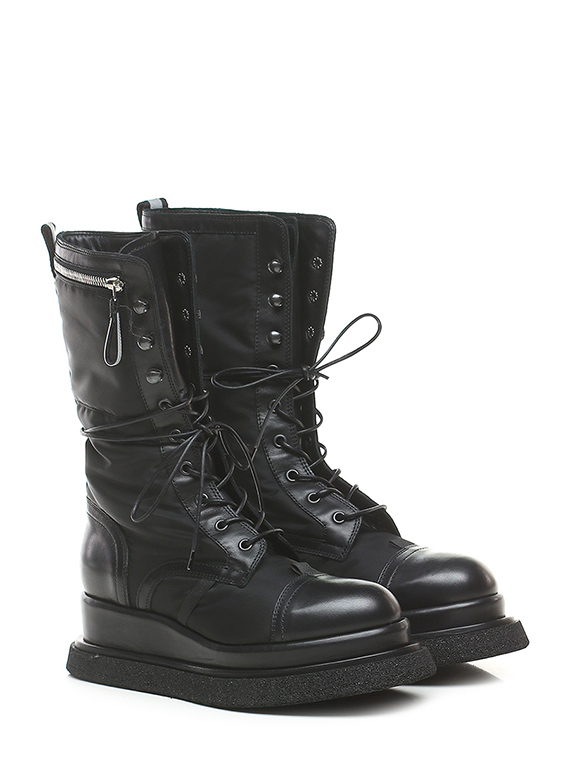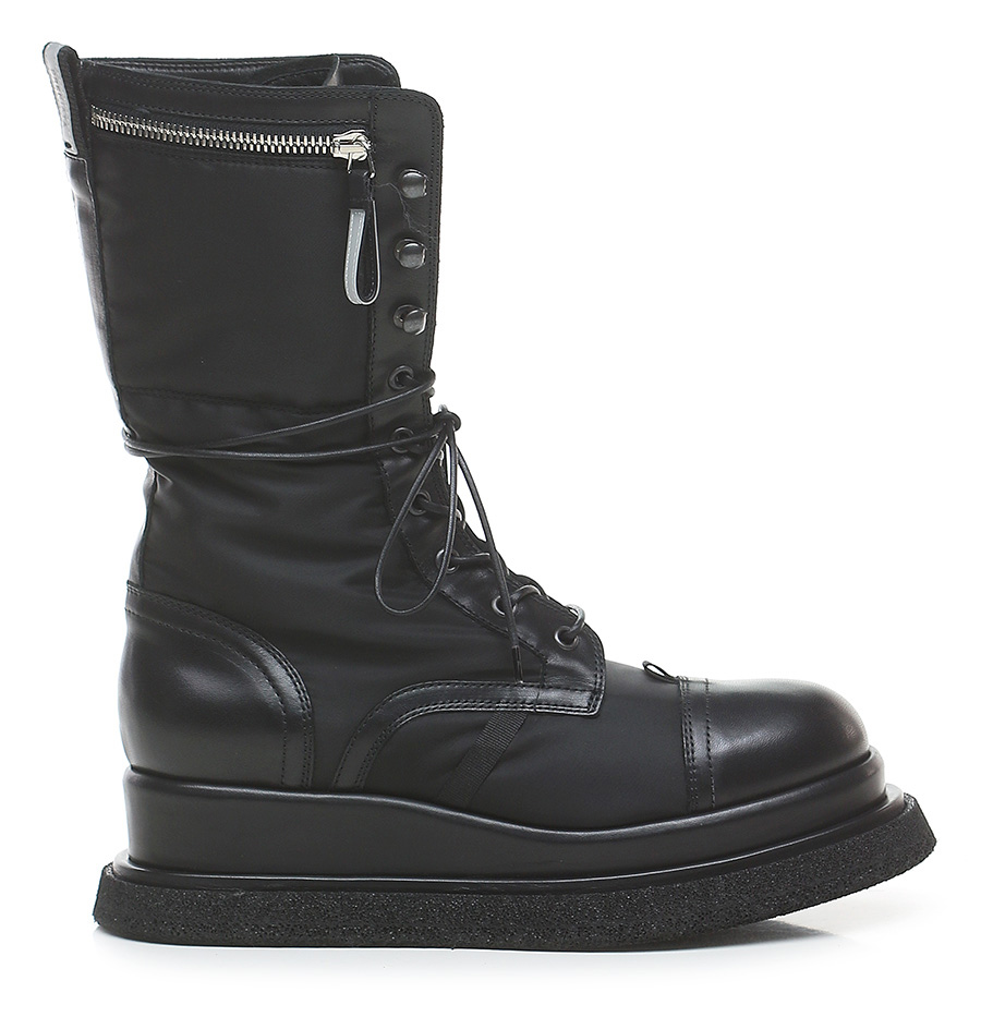 Boot in technical fabric and leather with side pocket with zip closure. Rubber sole. 55mm heel height, 40mm platform with 15mm ledge. Leg height 24.5cm. Part of the sole lined in leather.