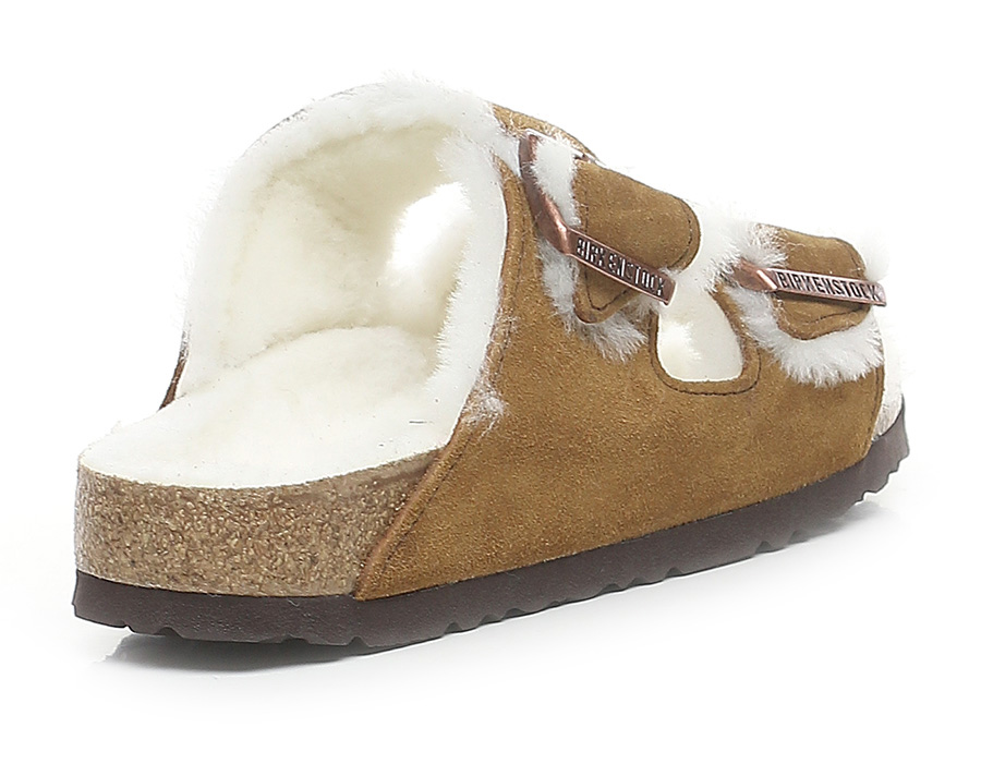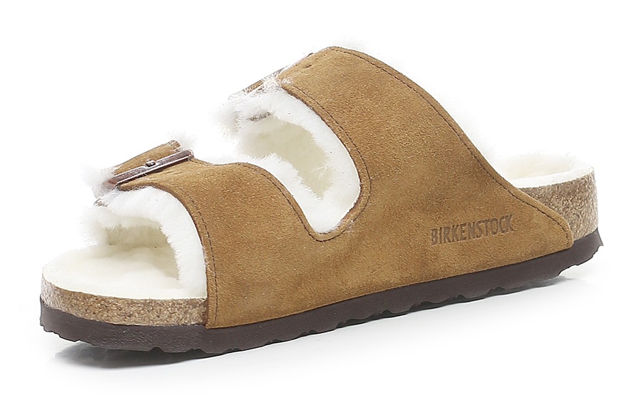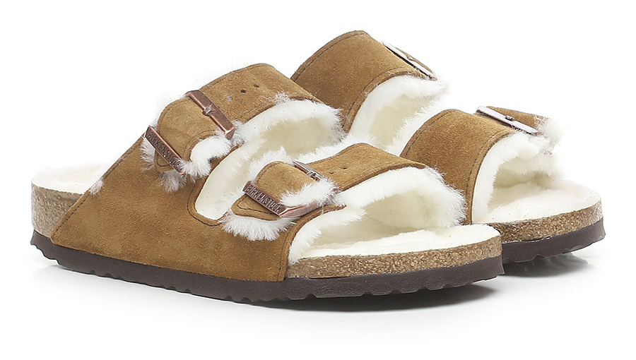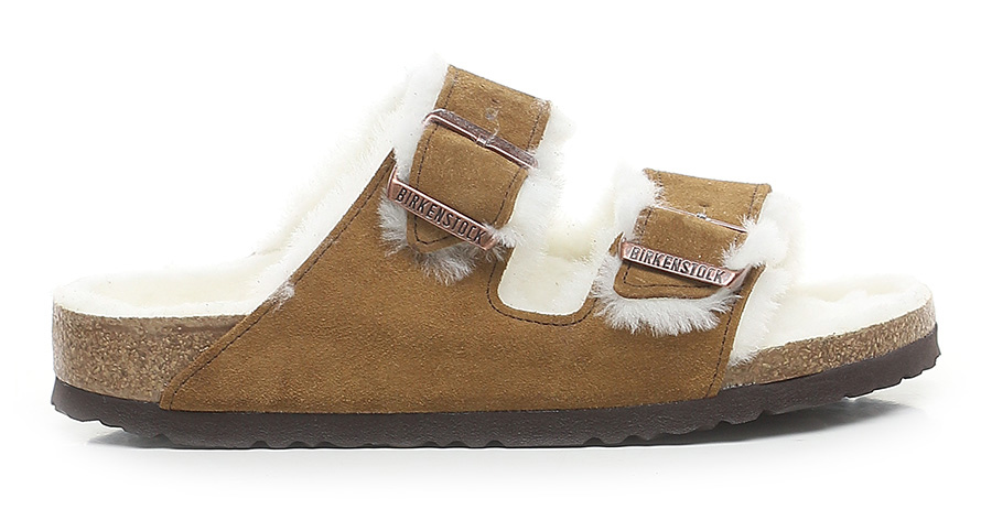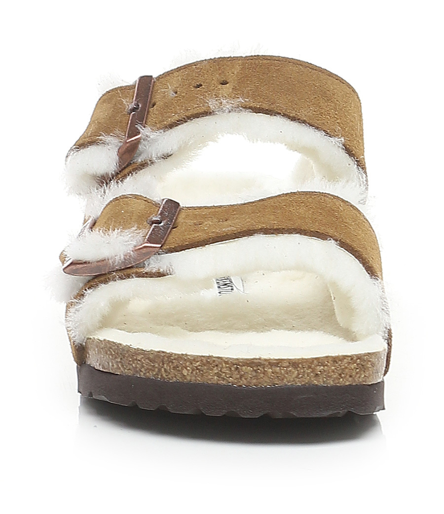Faux leather sandal lined in sheepskin with double adjustable front strap and rubber sole. Sole height 25mm.