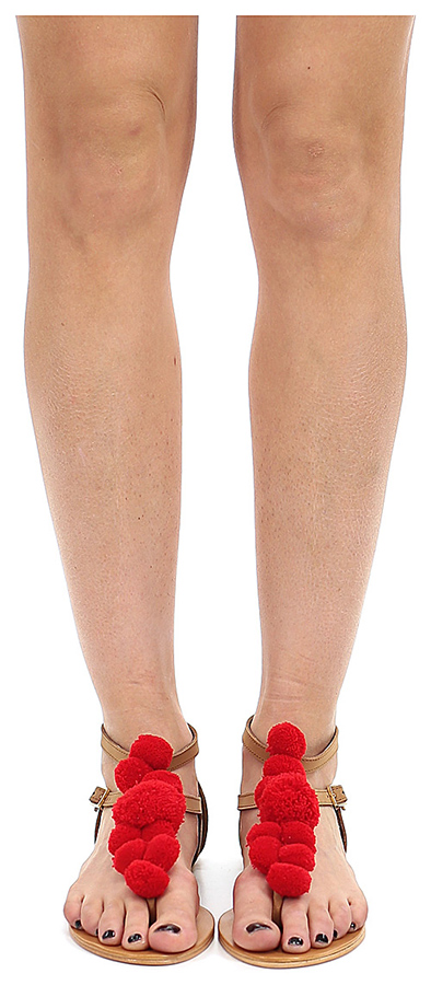 Low sandal in leather and fabric with double ankle strap and front pom poms. Leather sole.