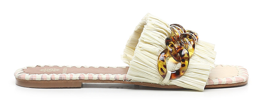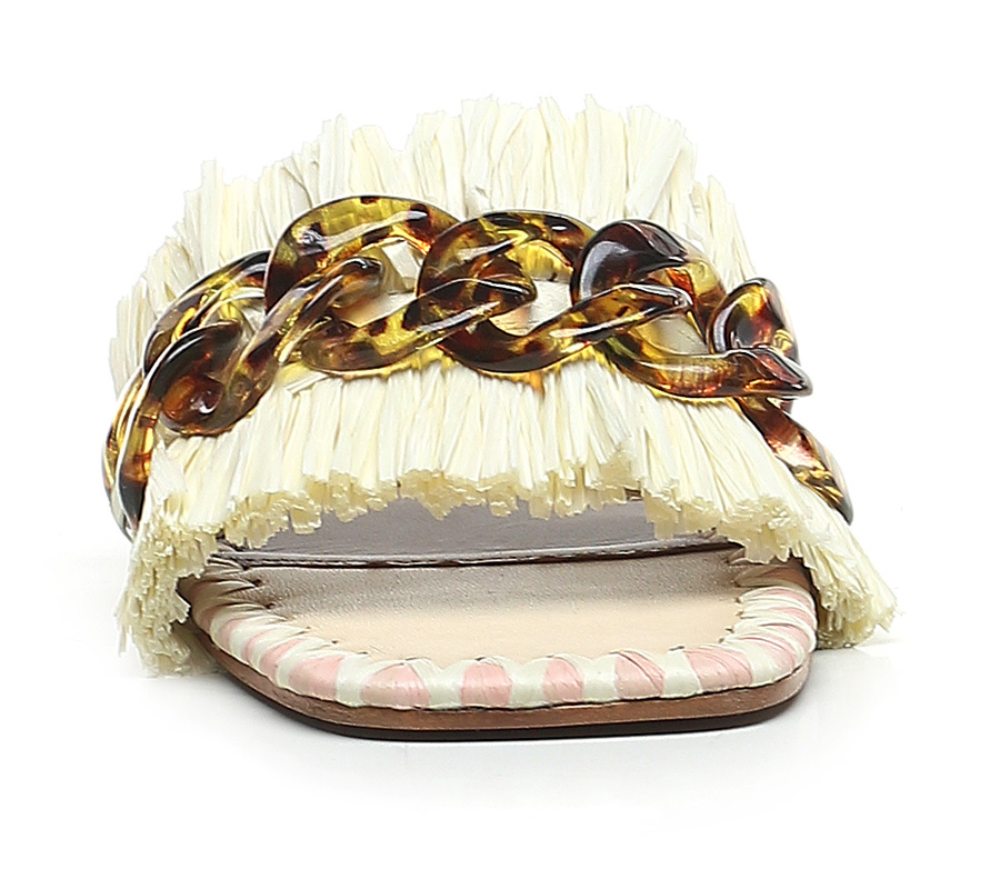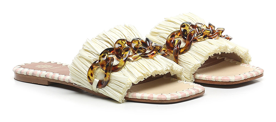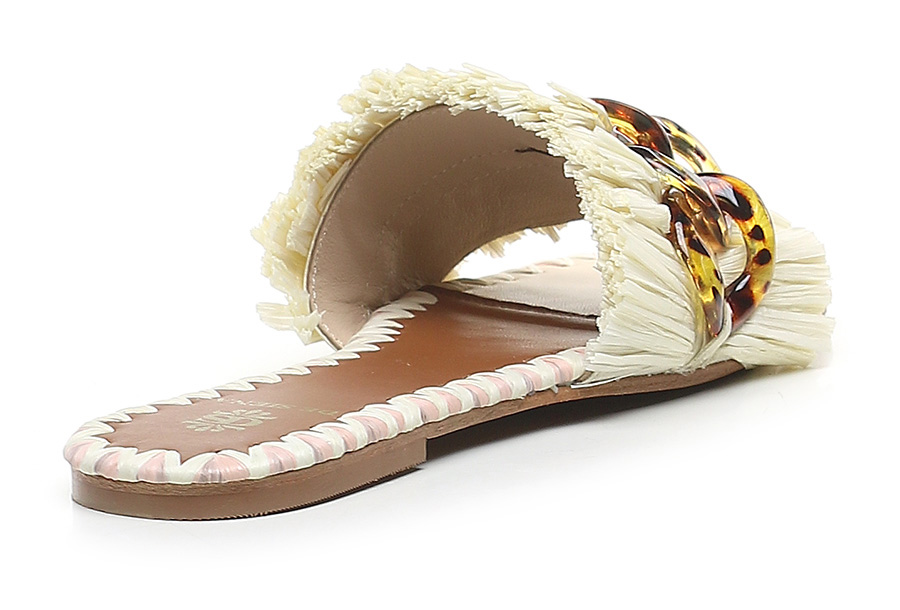 Sandal in fabric and raffia with front chain accessory. Leather and rubber sole.