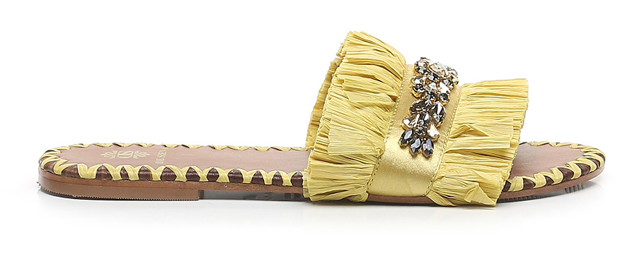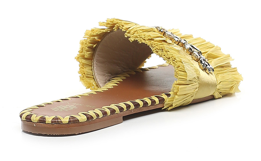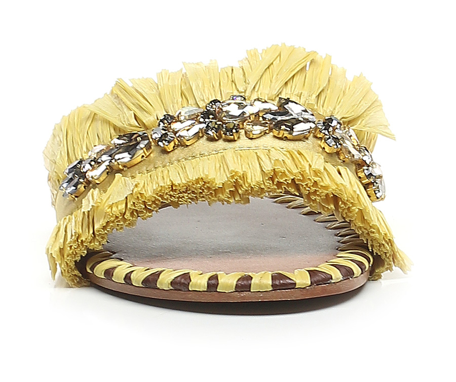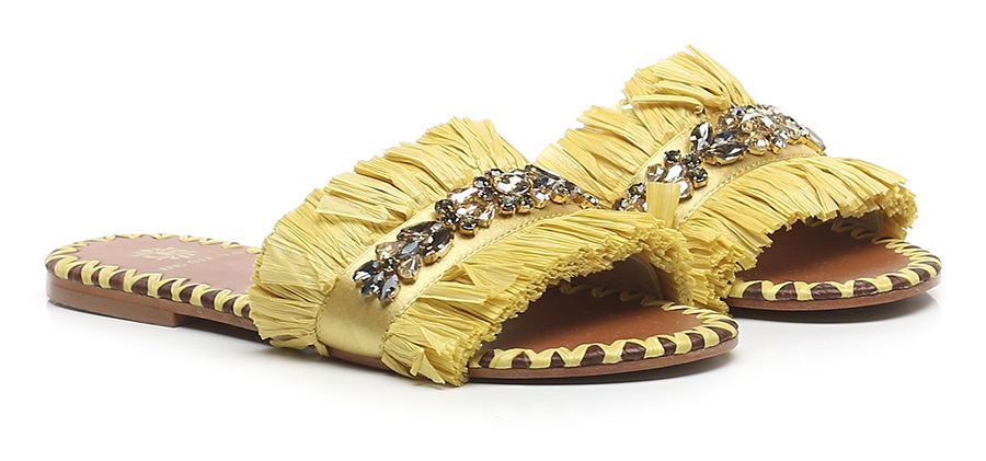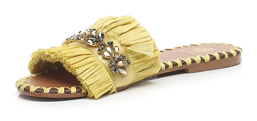 Sandal in fabric and raffia with stones and rhinestones on the front. Leather and rubber sole.