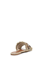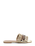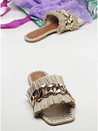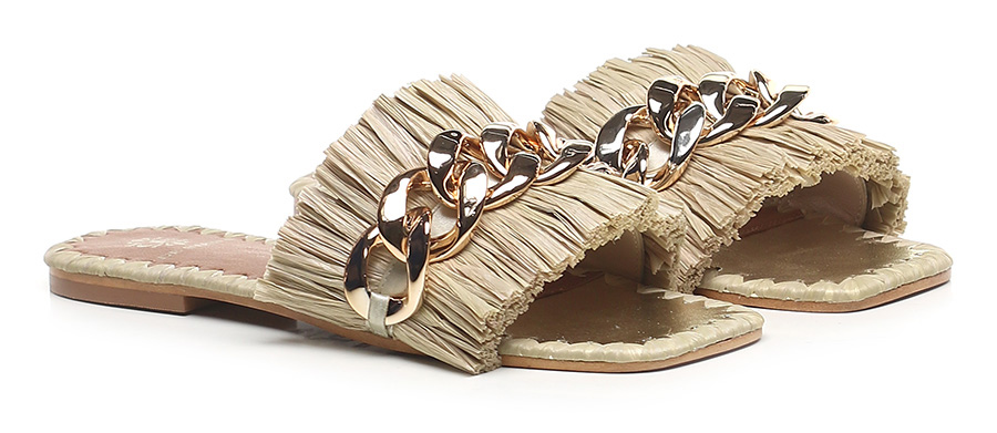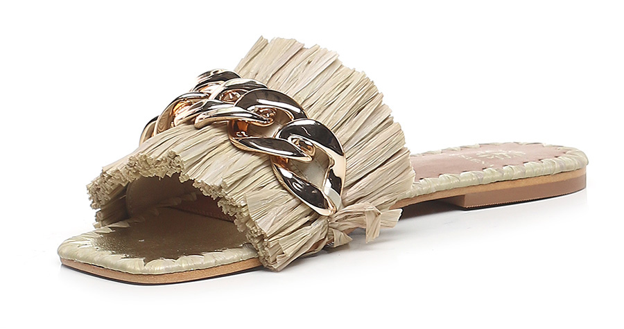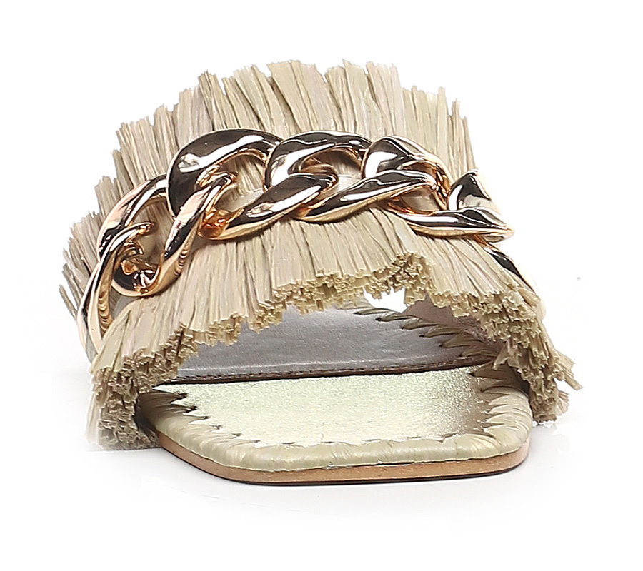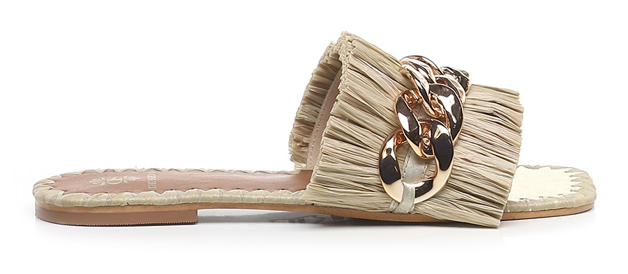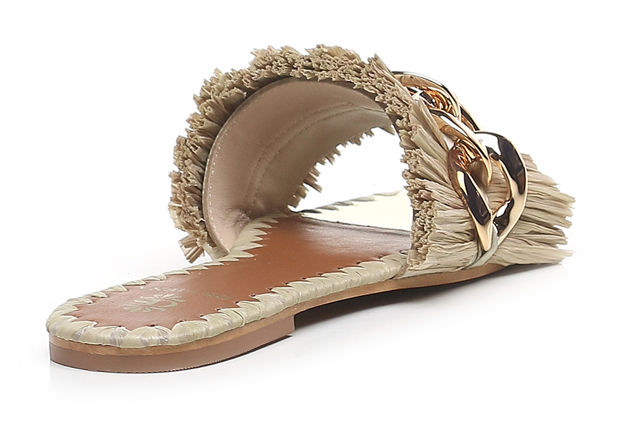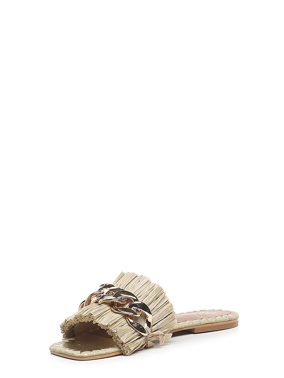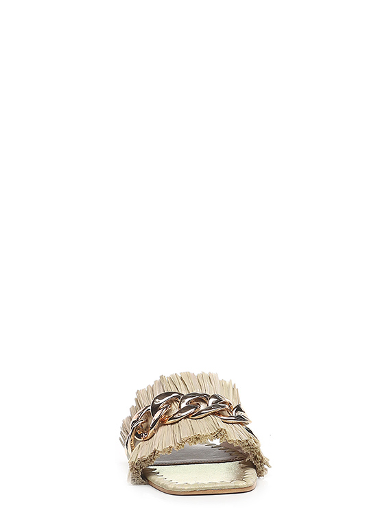 Sandal in fabric and raffia with front chain accessory. Leather and rubber sole.