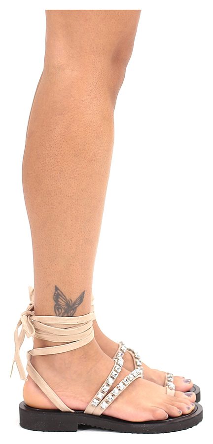 Low suede sandal with ankle fastening and metal applications and stones on the upper. Rubber sole, heel 30, platform 20 with ledge 10.
