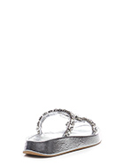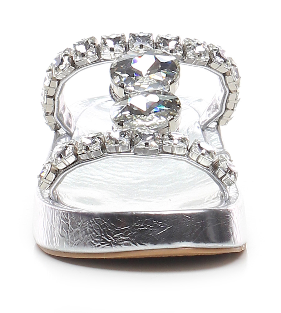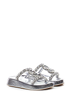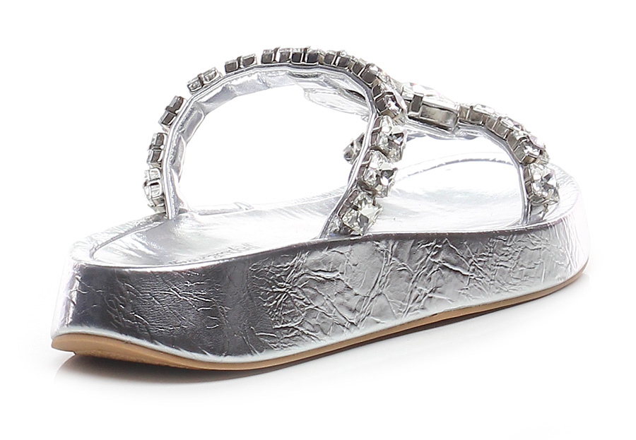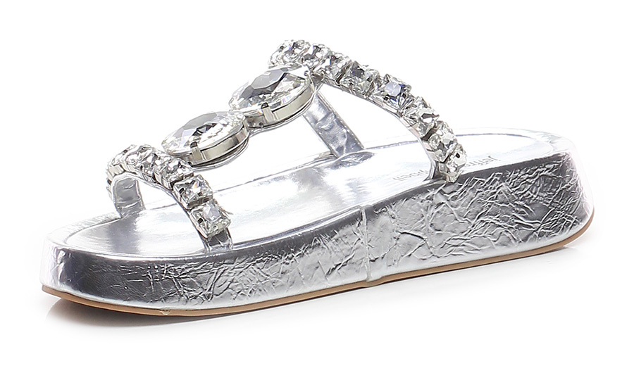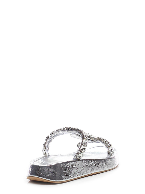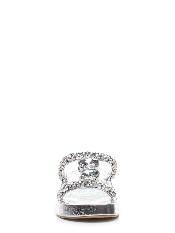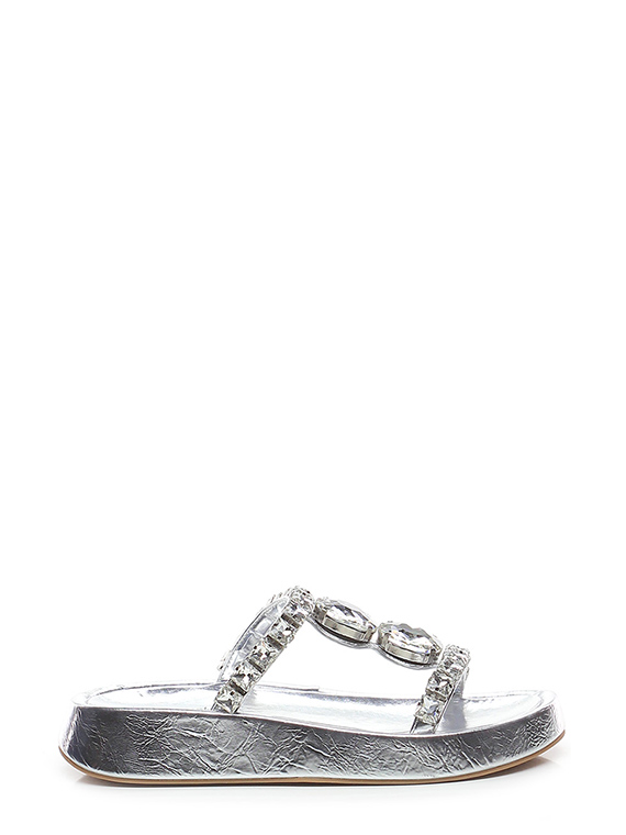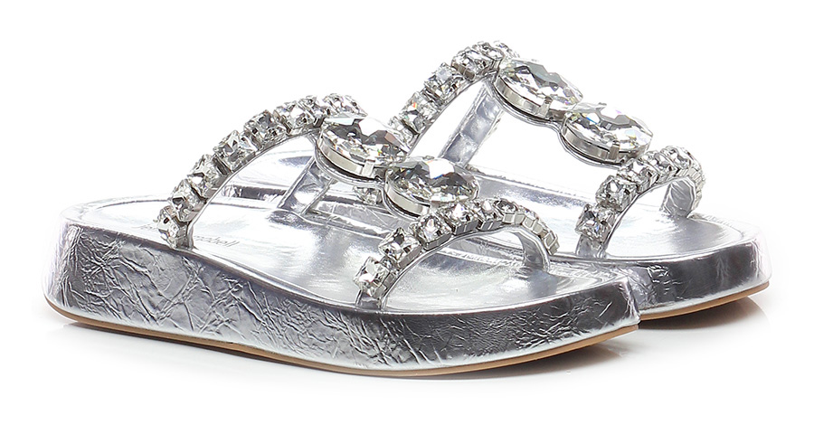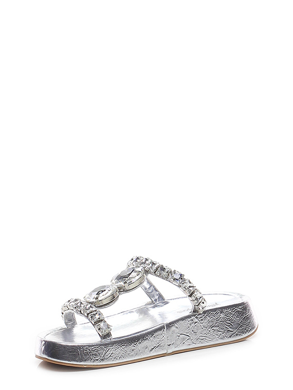 Low sandal in cracklé-effect laminated eco-leather with maxi faceted rhinestones on the upper, rubber sole. Heel 35, platform 25 with ledge 10. Shaped insole.