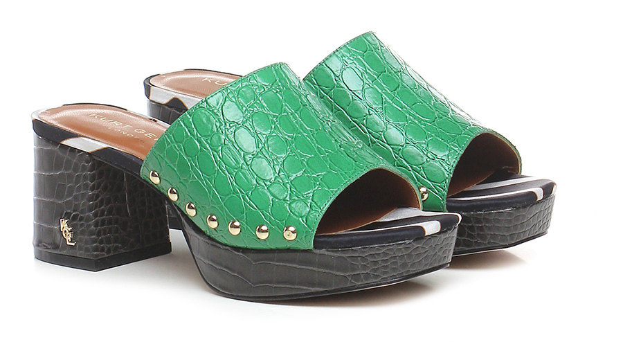 Flat sandal in crocodile print leather with studs on the edge of the sole. Rubber sole. Heel 70. platform 30 with ledge 40. Heel and platform covered in crocodile print leather.