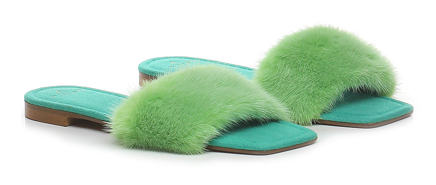 Flat sandal in 100% sustainable mink, rubber sole. 10mm heel.
