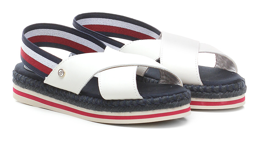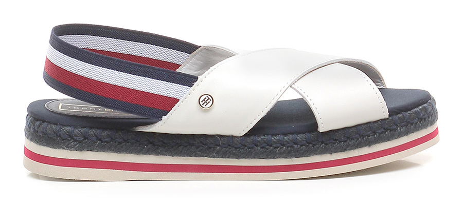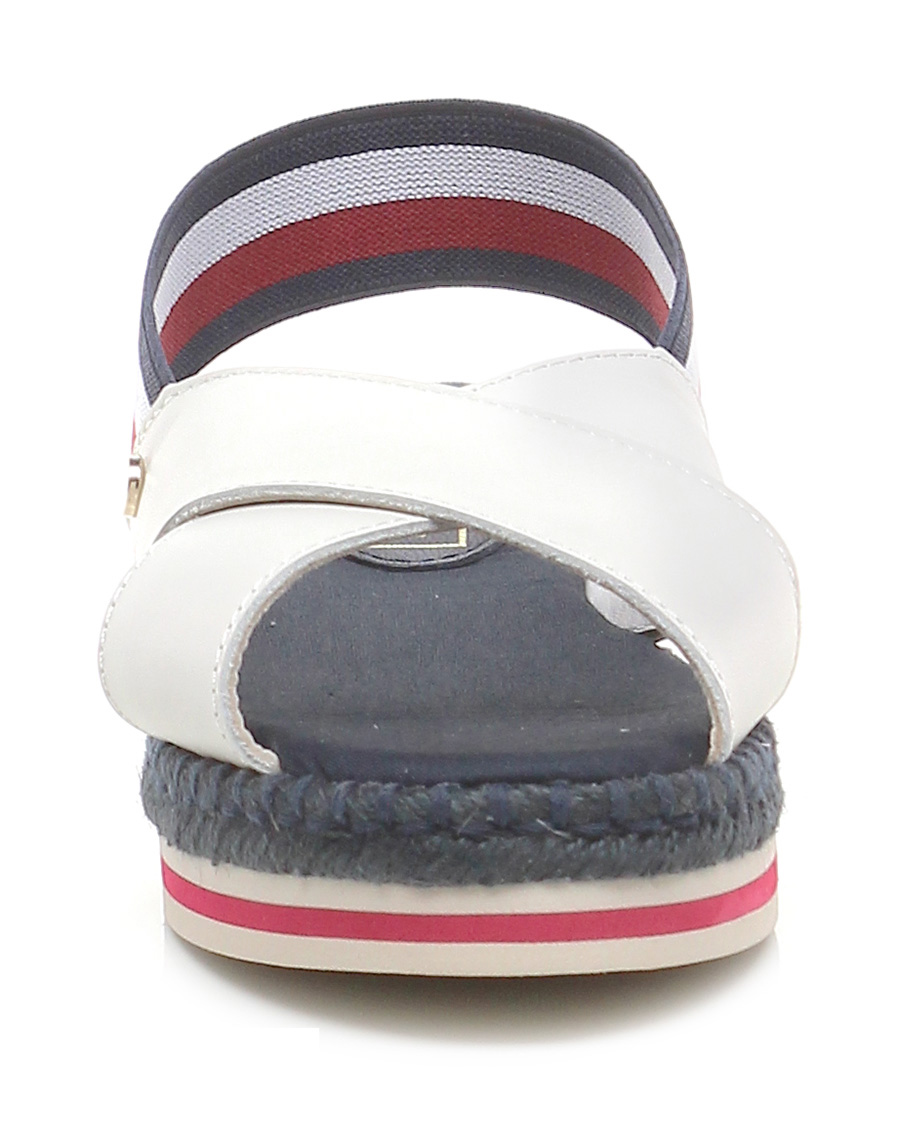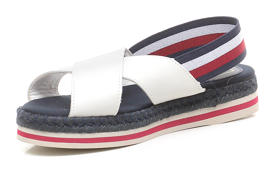 Low sandal in leather and fabric with elasticated back strap, rubber sole. Heel 35, platform 25 with ledge 10. Heel covered in rope.