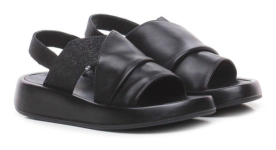 Low sandal in leather and crossover fabric with elasticated strap on the back, rubber sole. Heel 40, platform 25 with ledge 15. Fussbett insole.