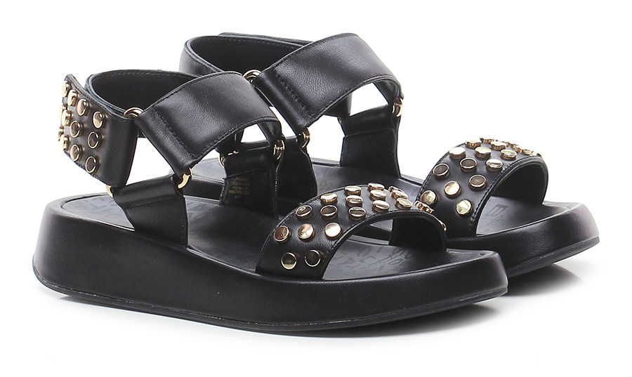 Low leather sandal with strap on the back with velcro closure. Studs on upper and closure. 40 heel, 25 platform with 15 bar.