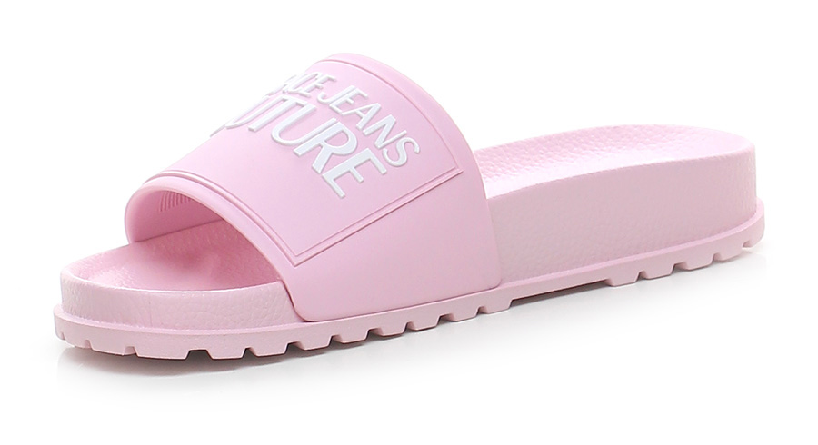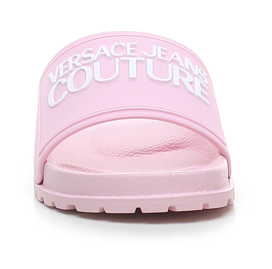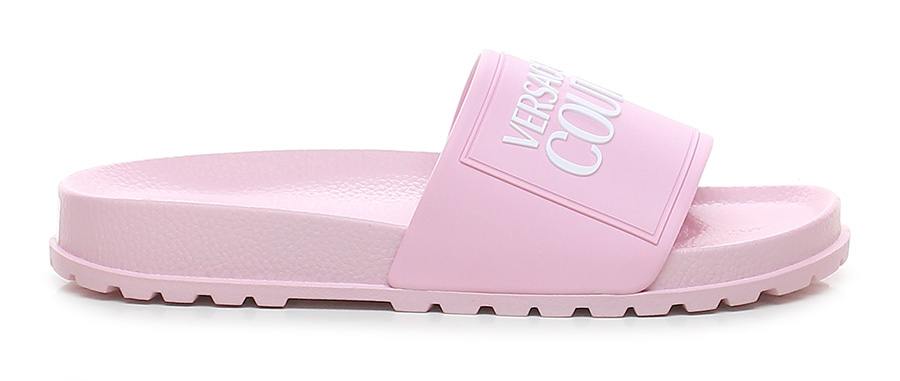 Low rubber sandal with lettering logo, Versace Jeans Couture on the strap. Rubber sole. Heel 25, platform 20 with ledge 5. Shaped insole