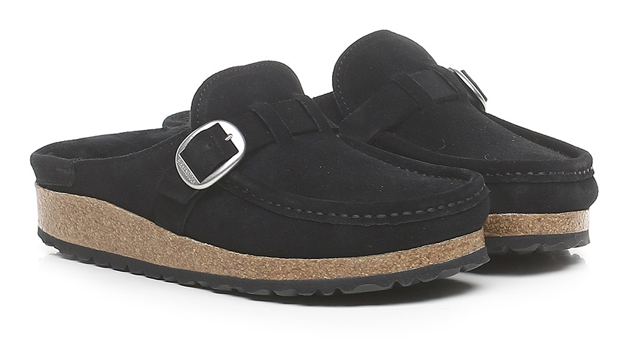 Suede shoe lined in sheepskin with adjustable front strap. Rubber sole. Sole height 25mm.