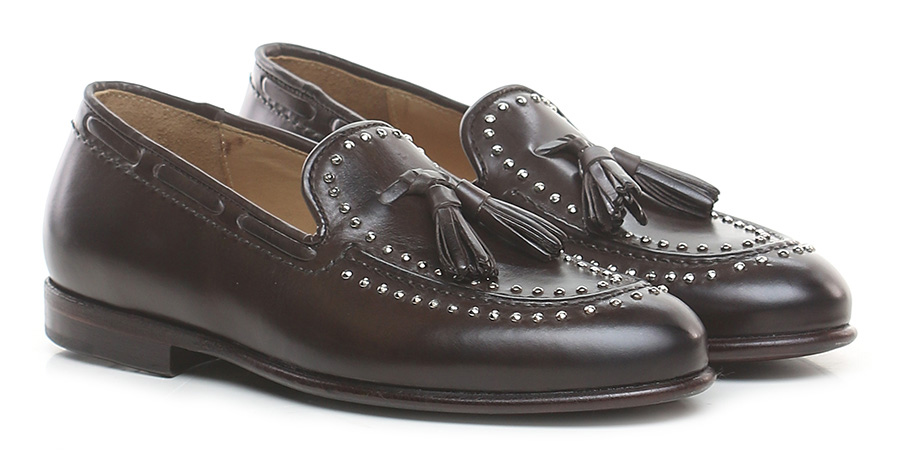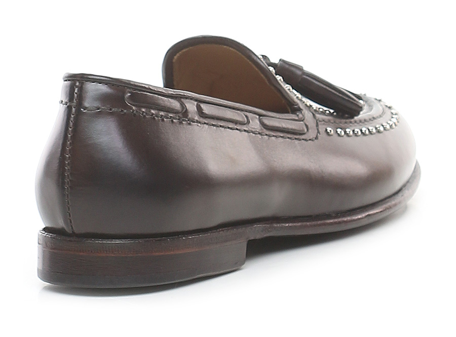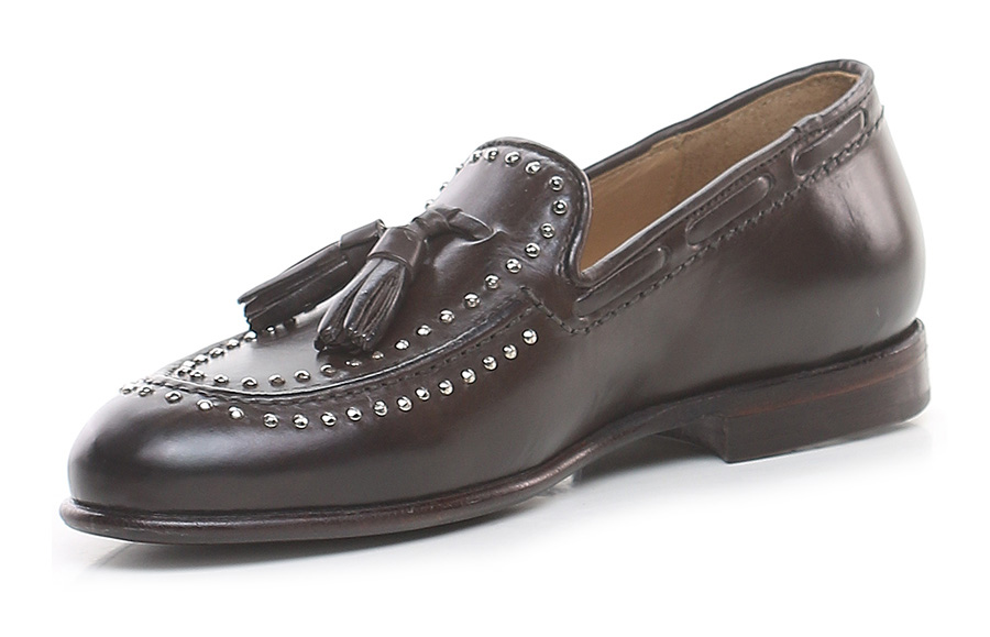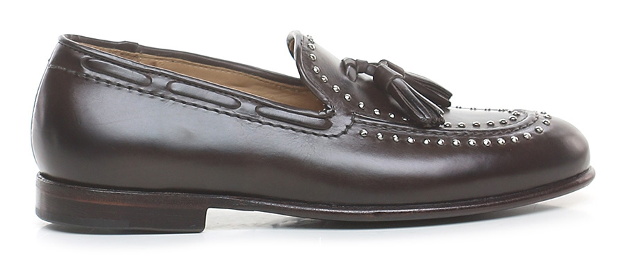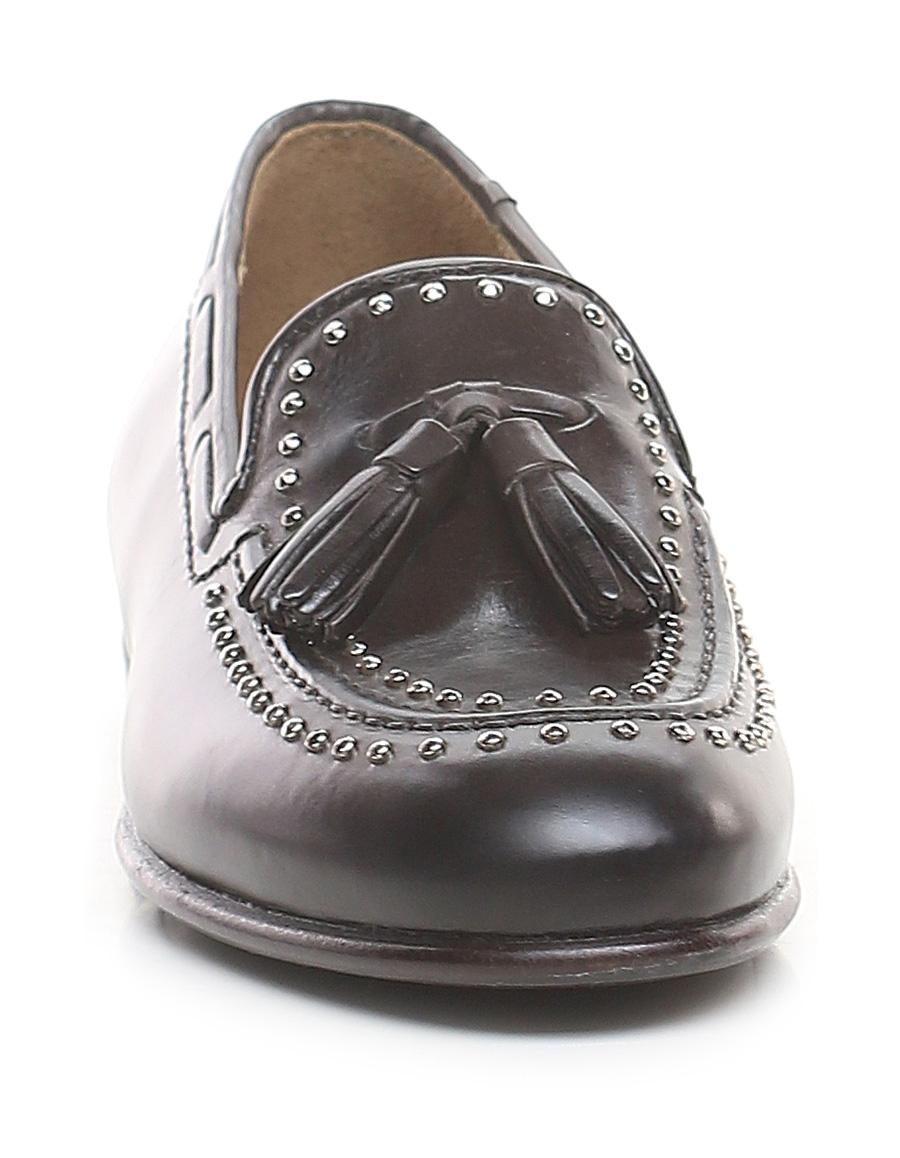Moccasin in vintage effect leather with tassels and front studs. Leather and rubber sole. Heel height 20mm.