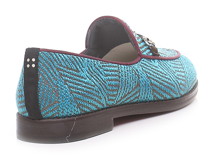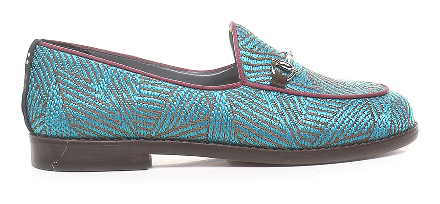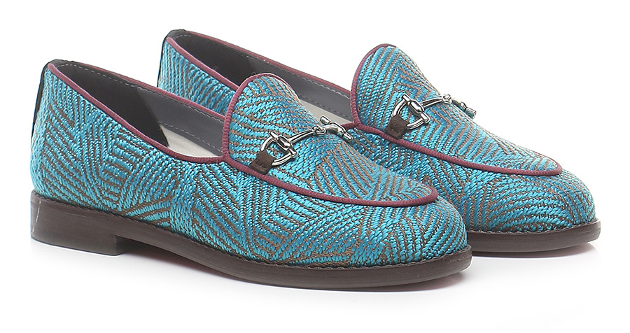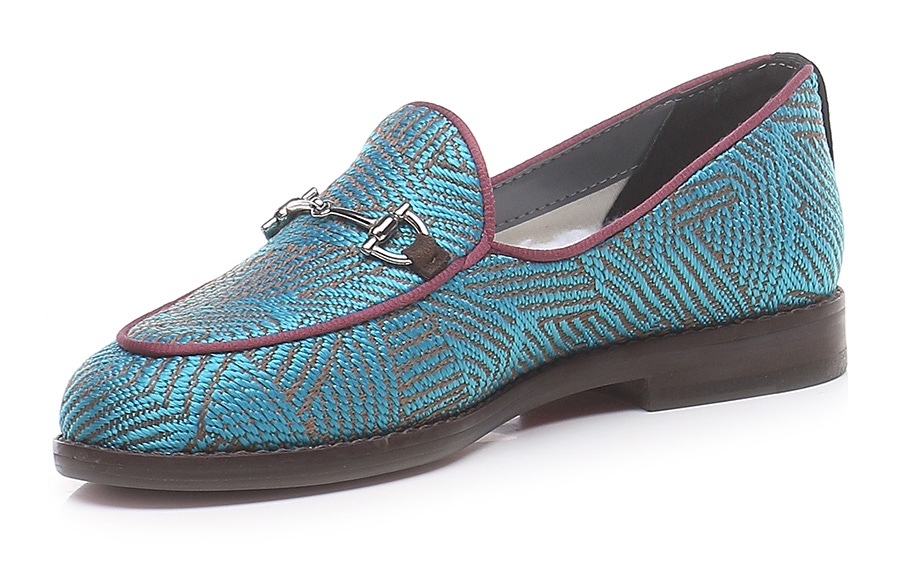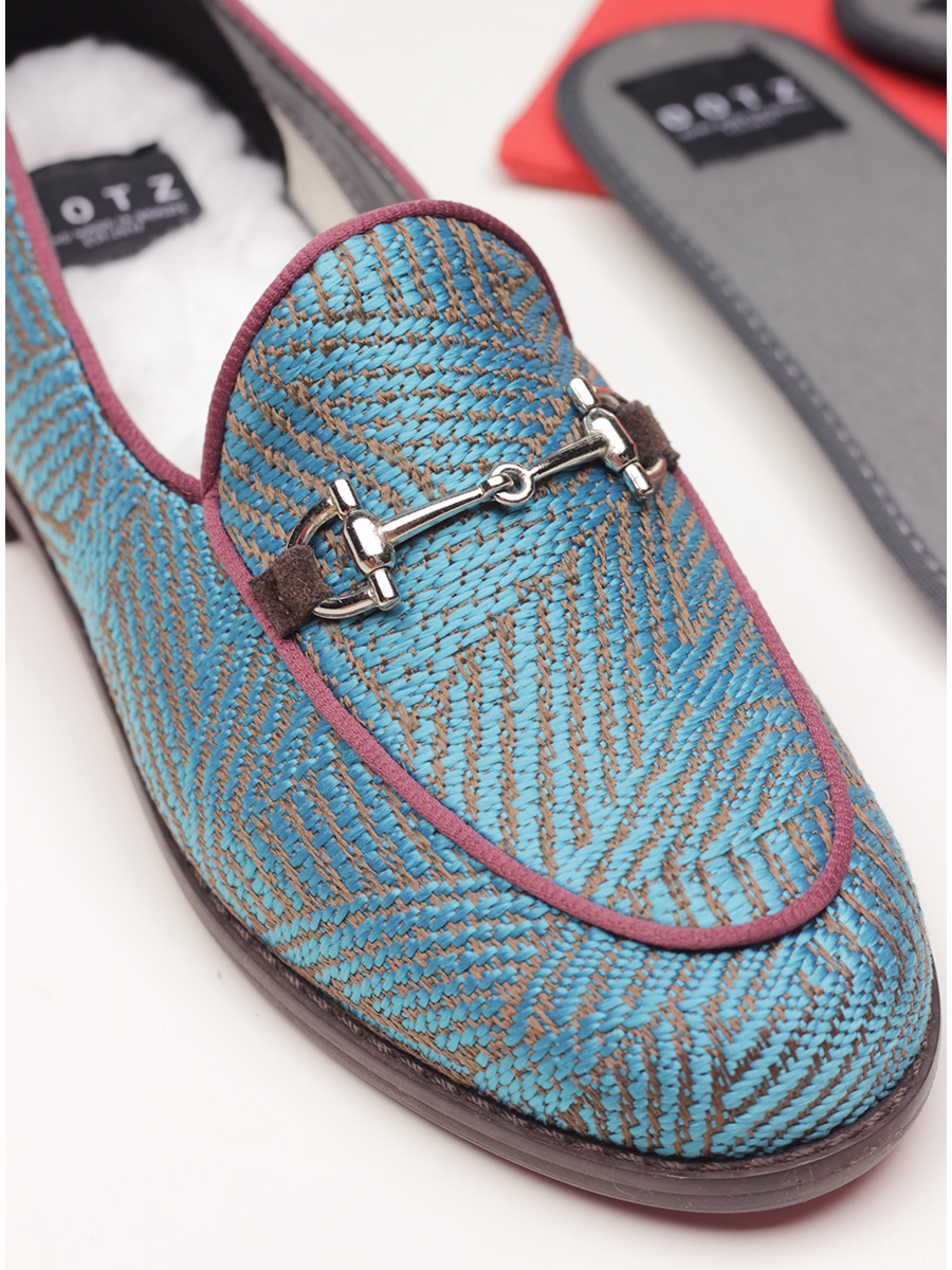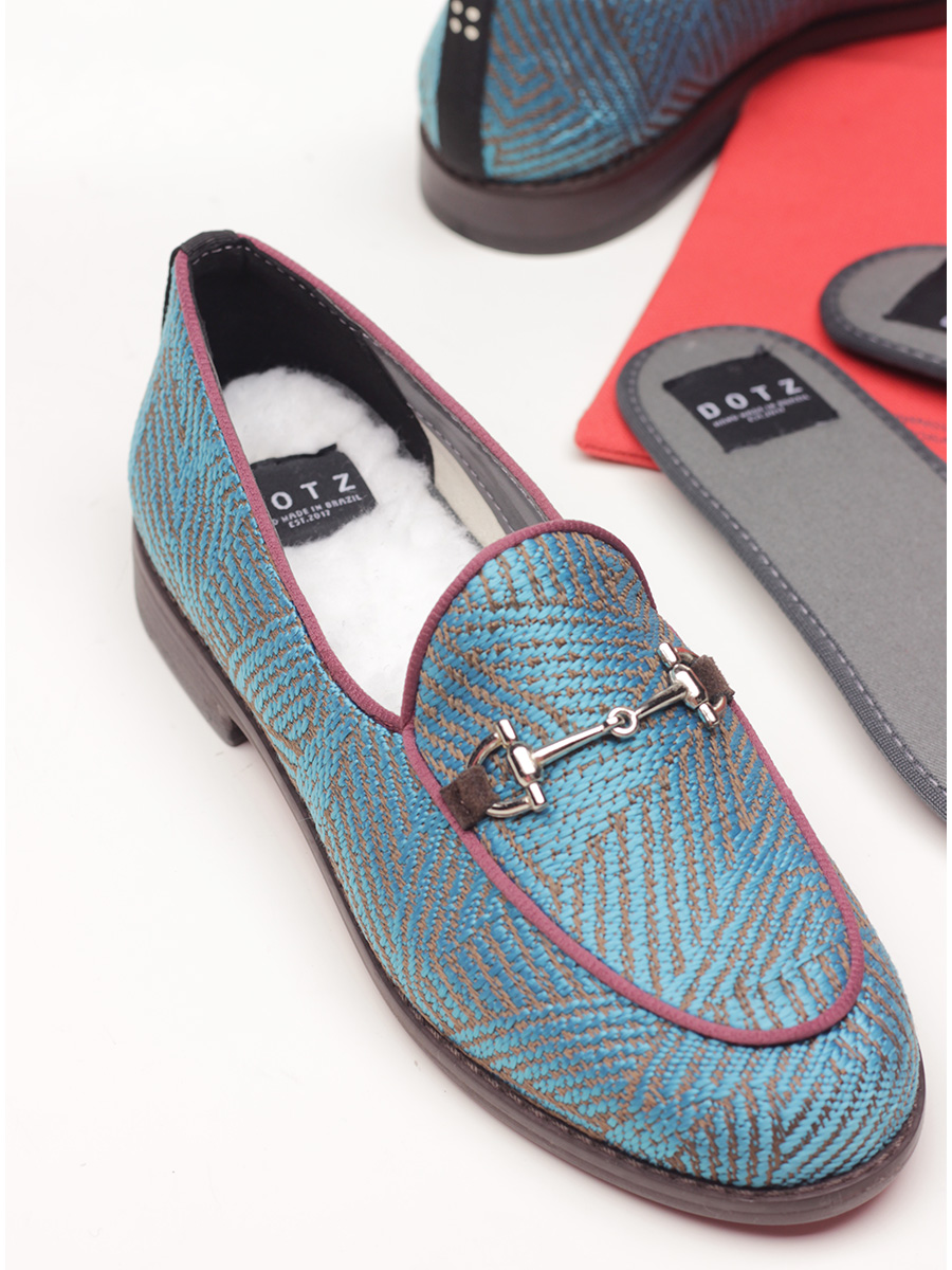 Shoe in recycled cotton with front clamp and sole in vegan material. Heel height 20mm. Insole in sheepskin interchangeable with another insole in fabric. The box, inner shoe bag and details are made from recycled household waste materials. Handmade in Brazil.