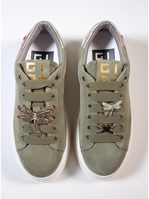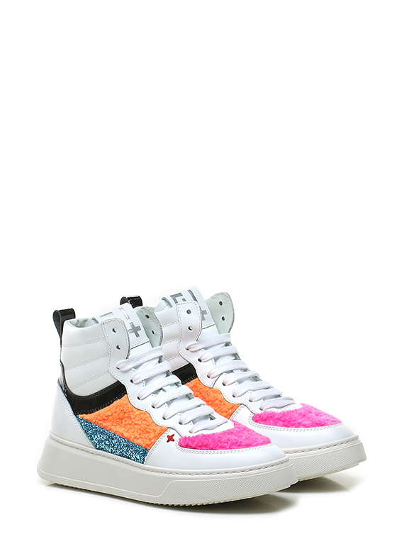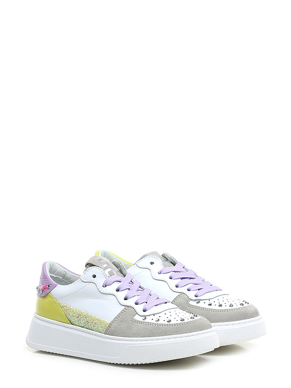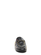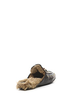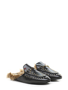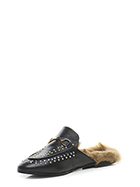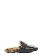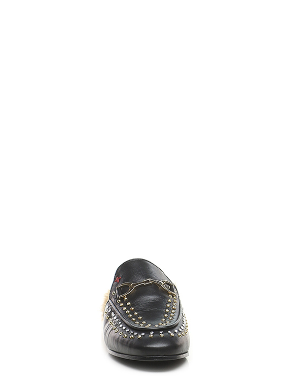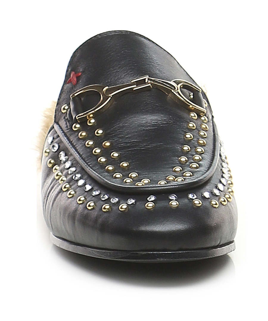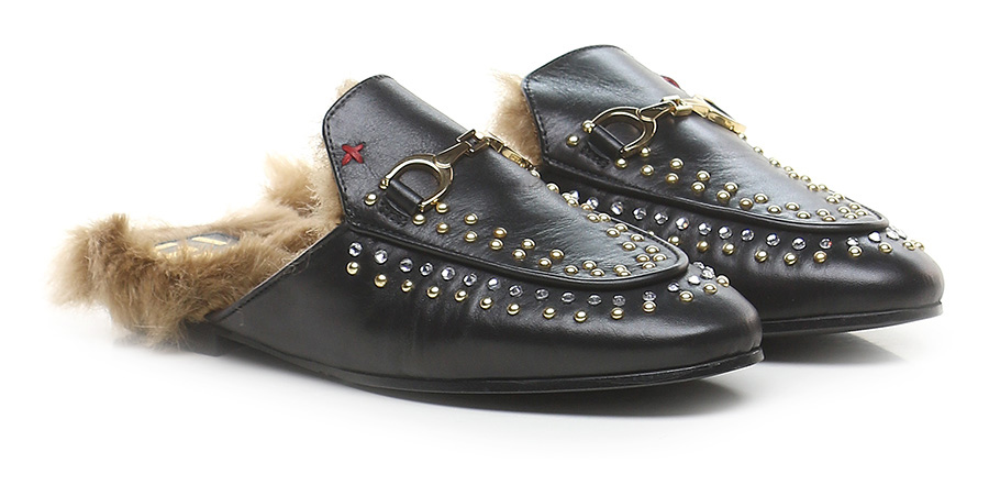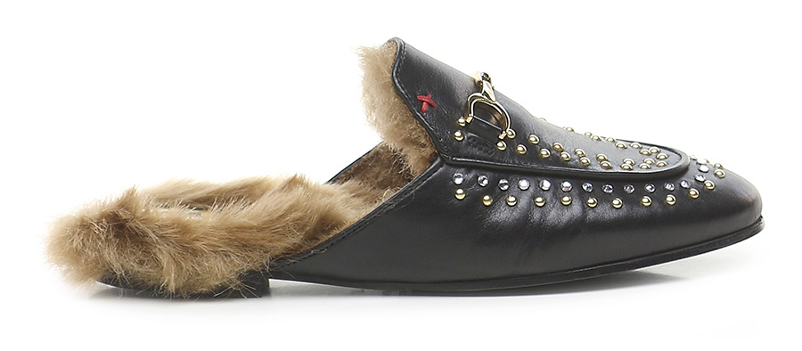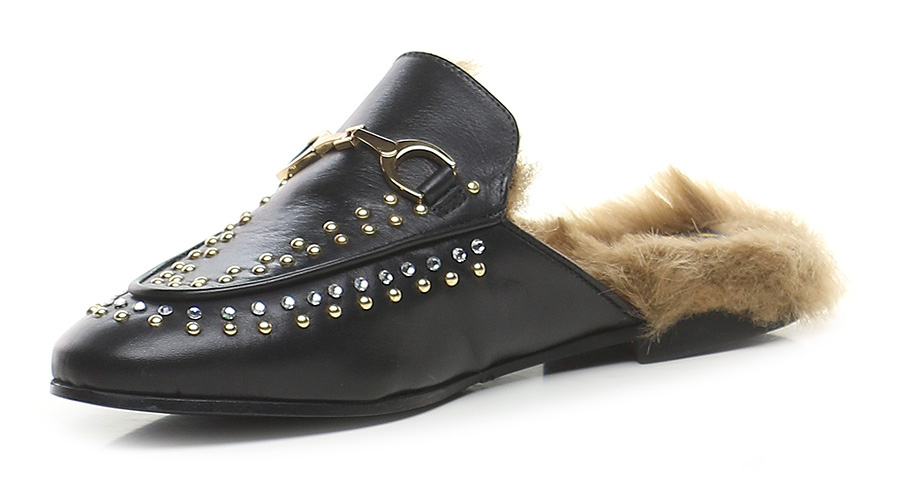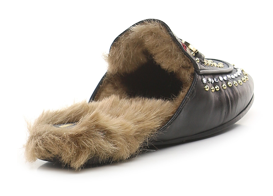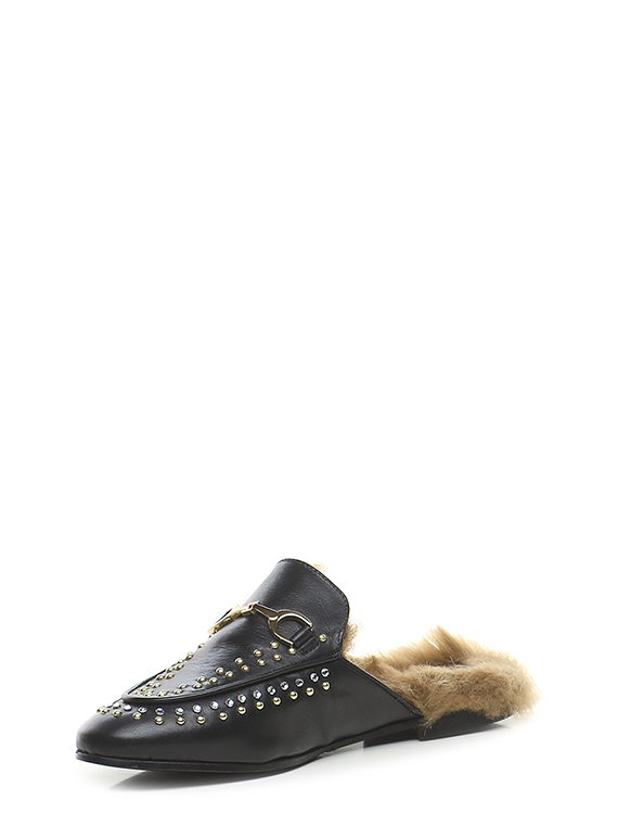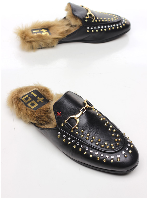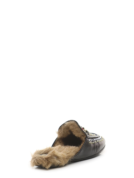 Leather shoe with gold metal accessory. Studs and rhinestones on the upper. Interior lined in fake fur. Rubber sole. Heel height 15mm.