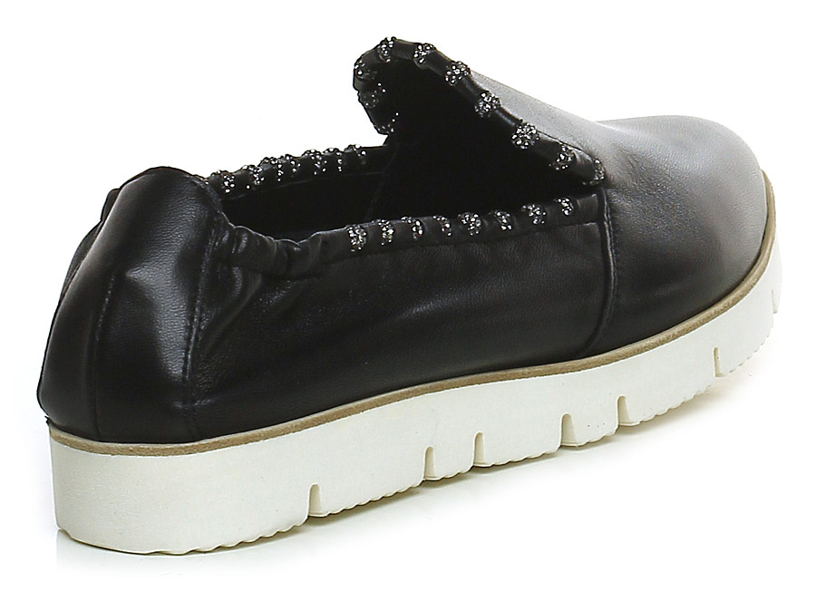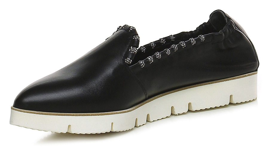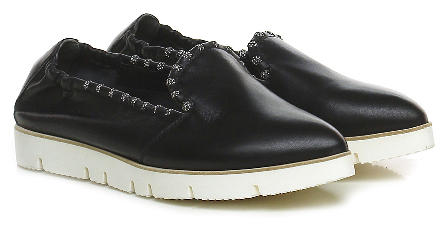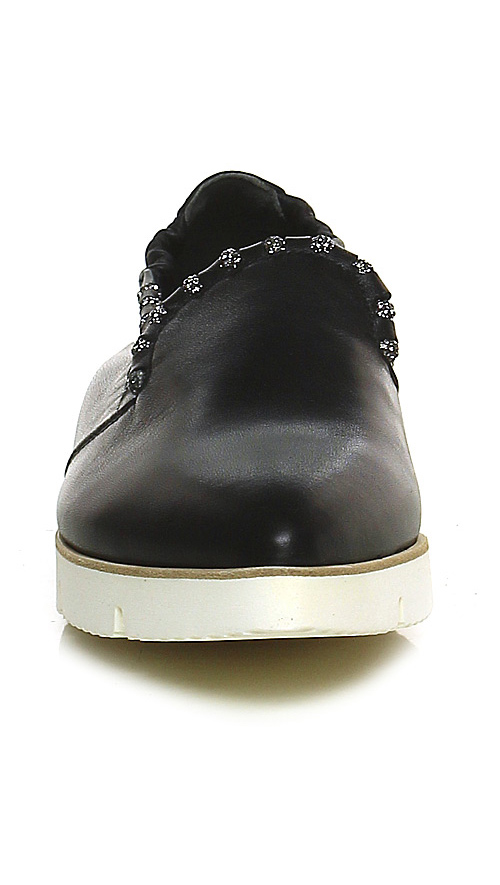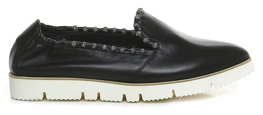 Low shoe in leather with elasticated insert on the profile and rhinestones. Extra light rubber sole. Heel 25.
