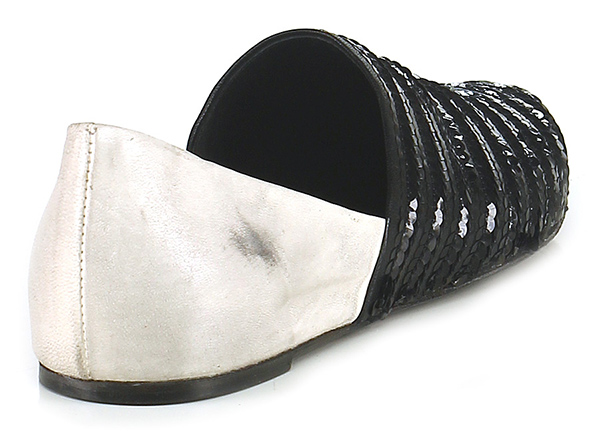 Low shoe in vintage leather with sequins on the upper and leather sole. Internal wedge, heel 30.