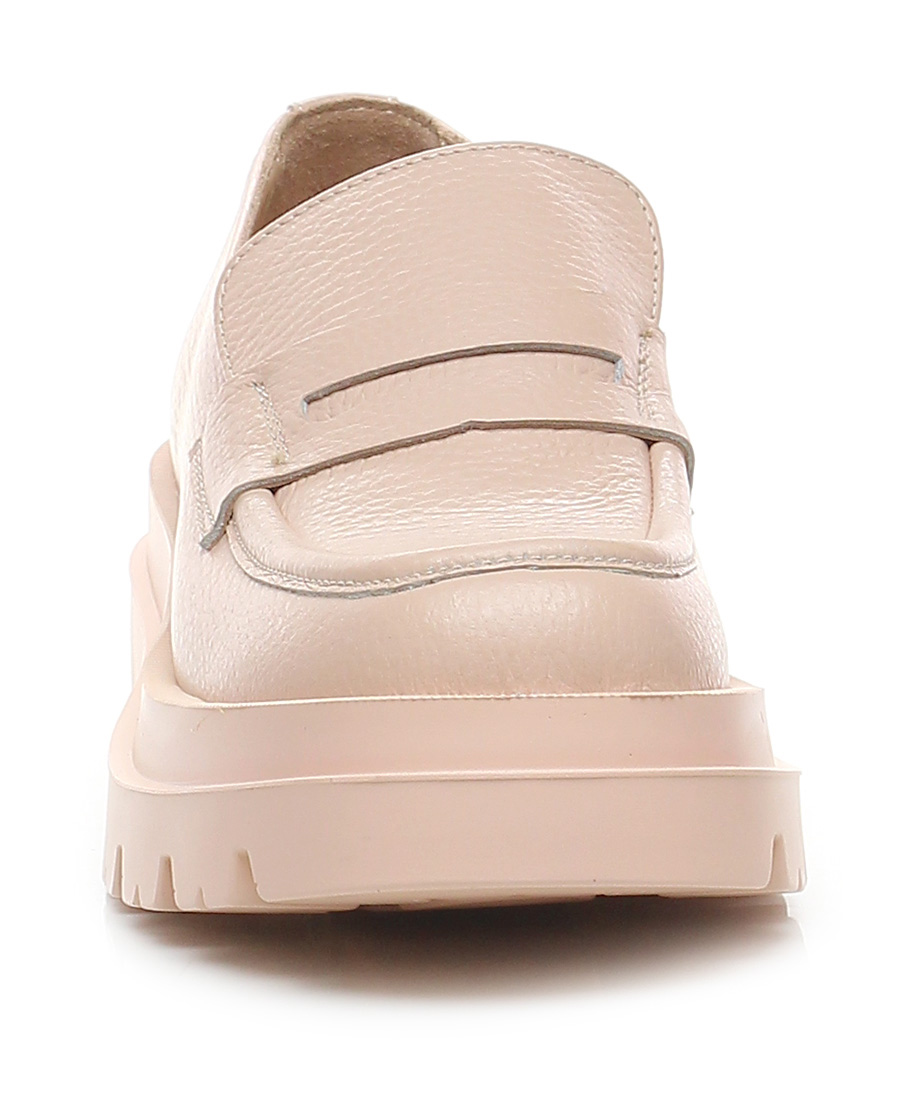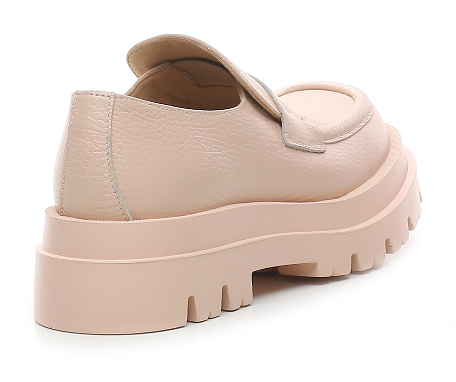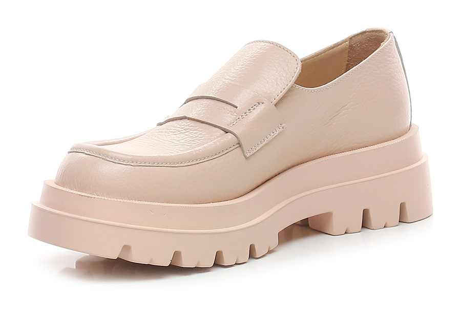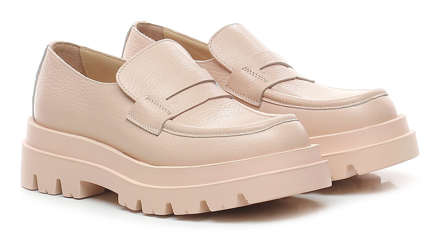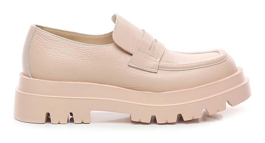 Low chunky-style shoe in textured effect leather, rubber sole. 55 heel, 35 platform with 20 ledge. Elasticated insert under the tongue. Point team.