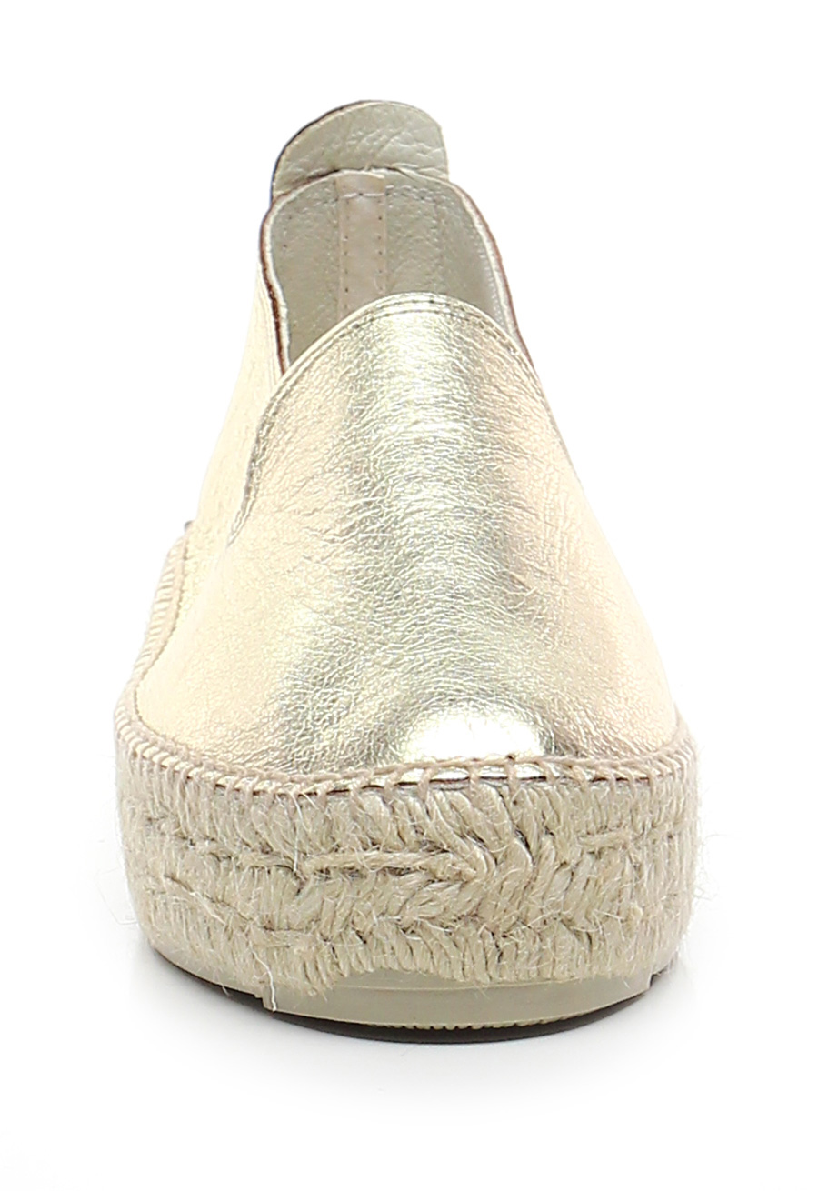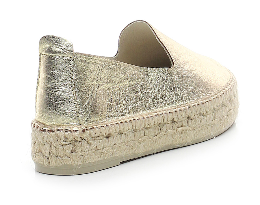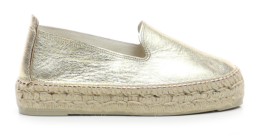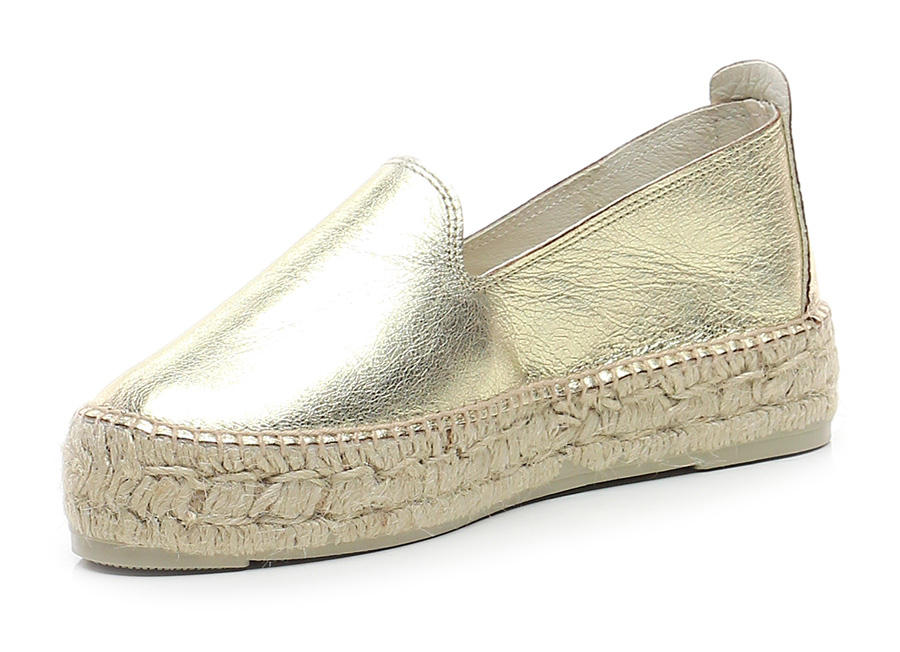 Flat shoe Manebi espadrille style in laminated leather, rubber sole. Heel 30, platform 30. Sole border in rope. Small fit.
