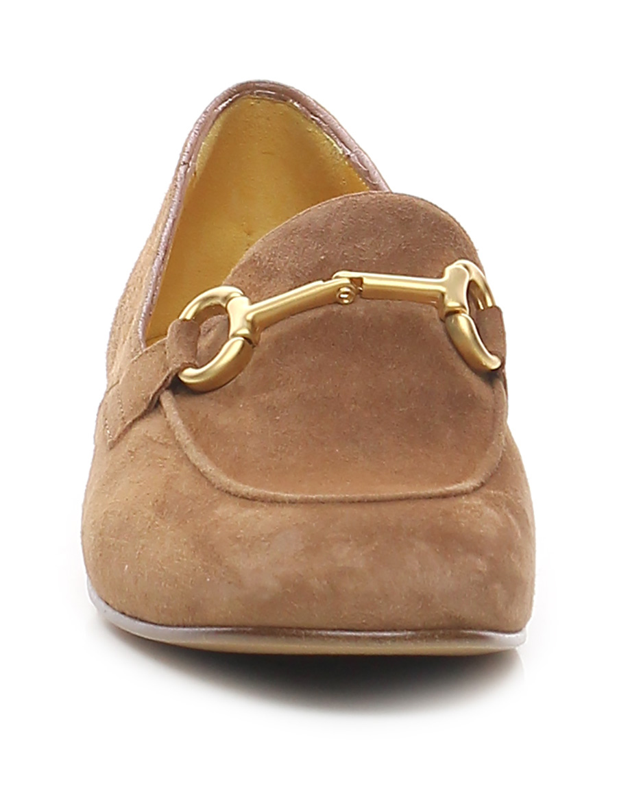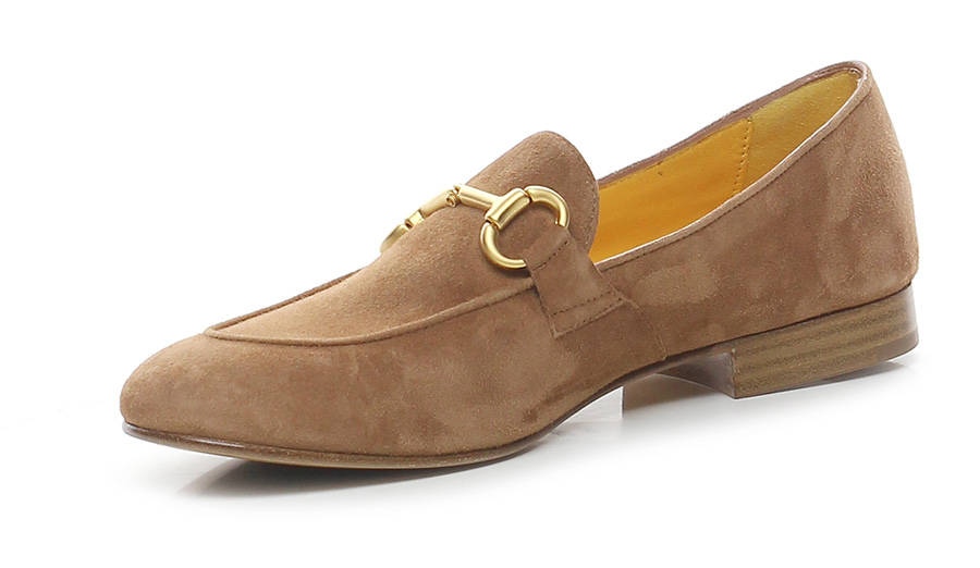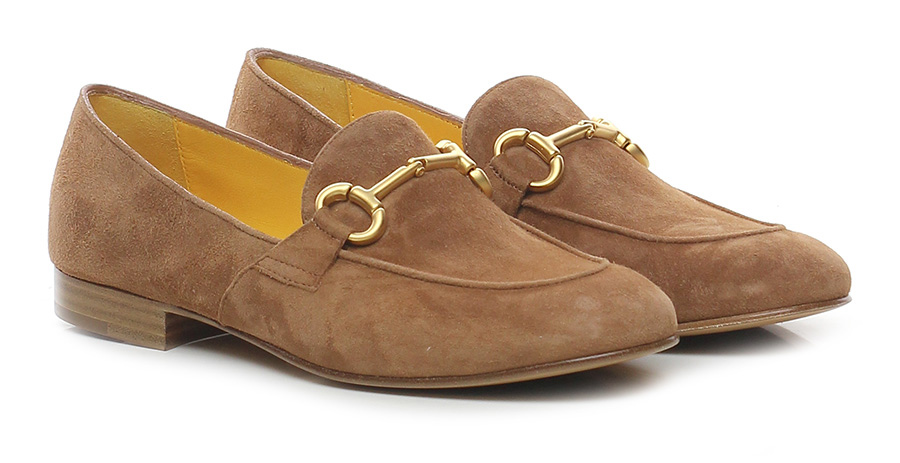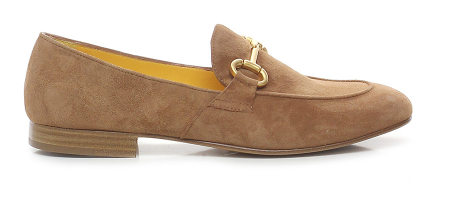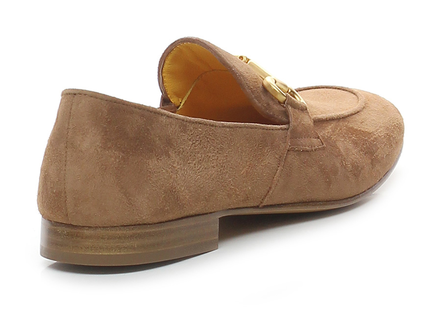 Loafer-style low shoe in suede with metal front clamp, leather and rubber sole. Heel 25. Almond toe.