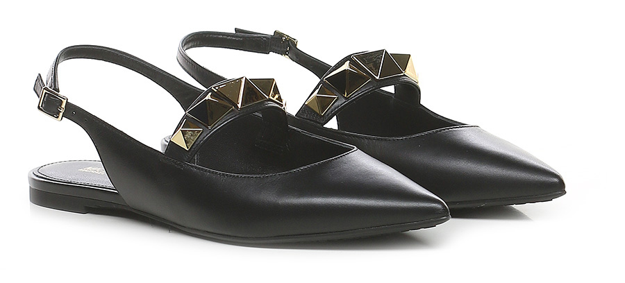 Leather shoe with back strap and front gold studs. Rubber sole. Heel height 15mm.