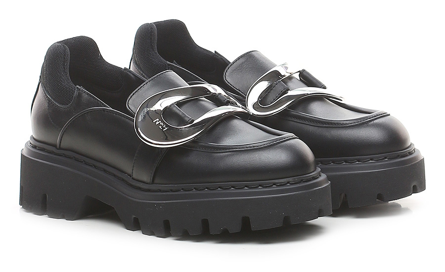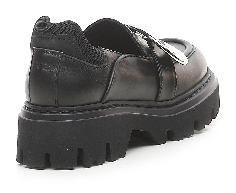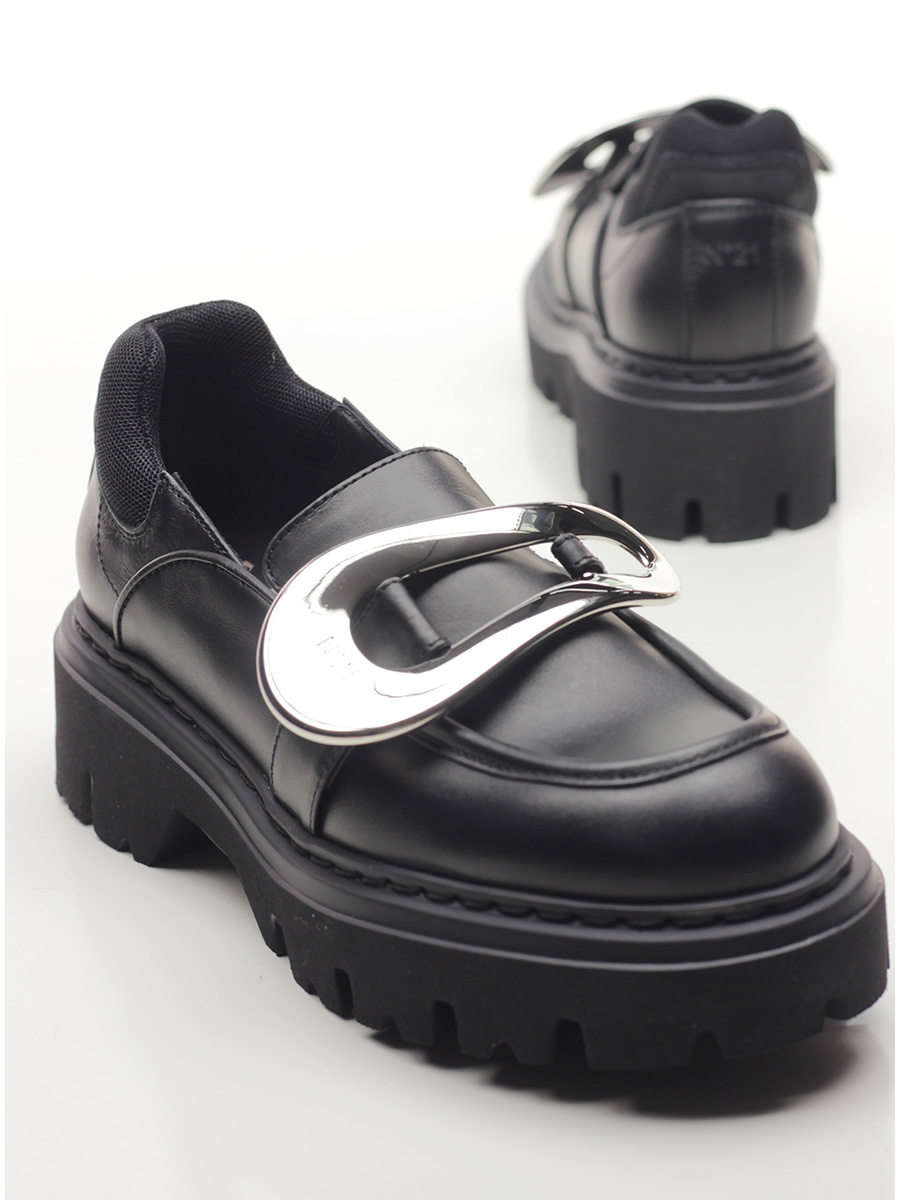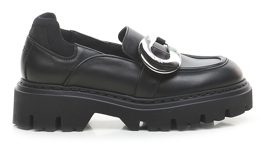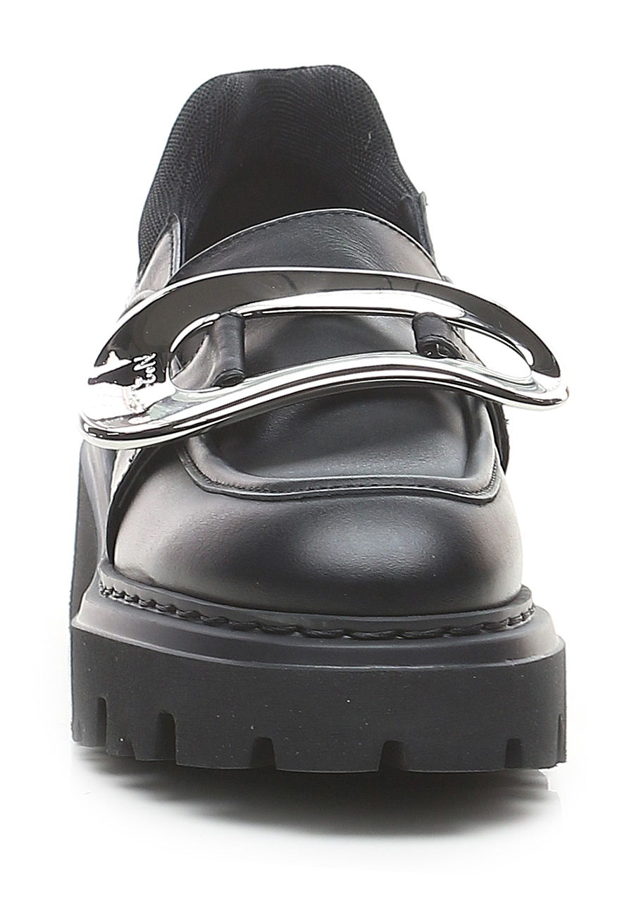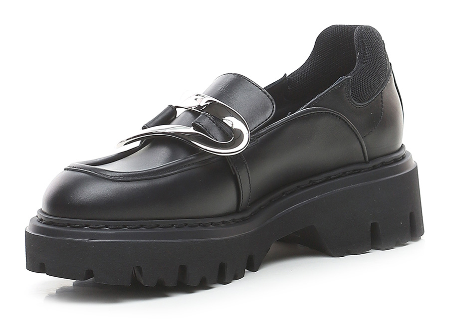 Leather shoe with fabric heel tab and metal front accessory. Rubber sole. 55mm heel height, 35mm platform with 20mm ledge.