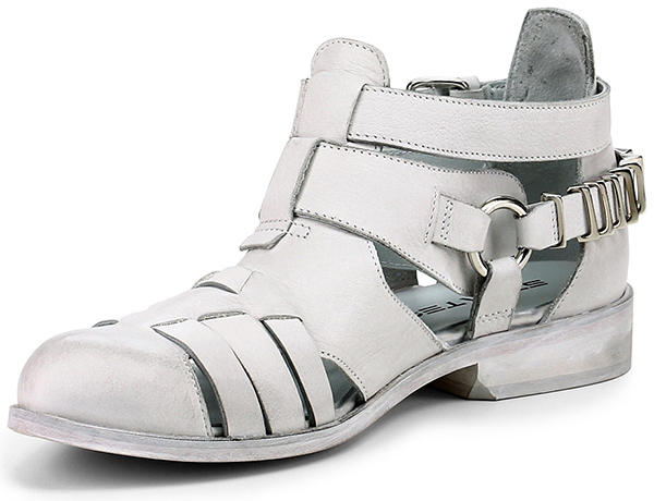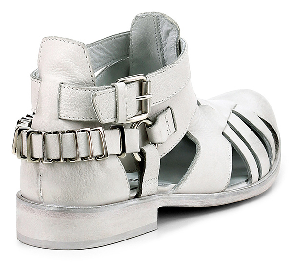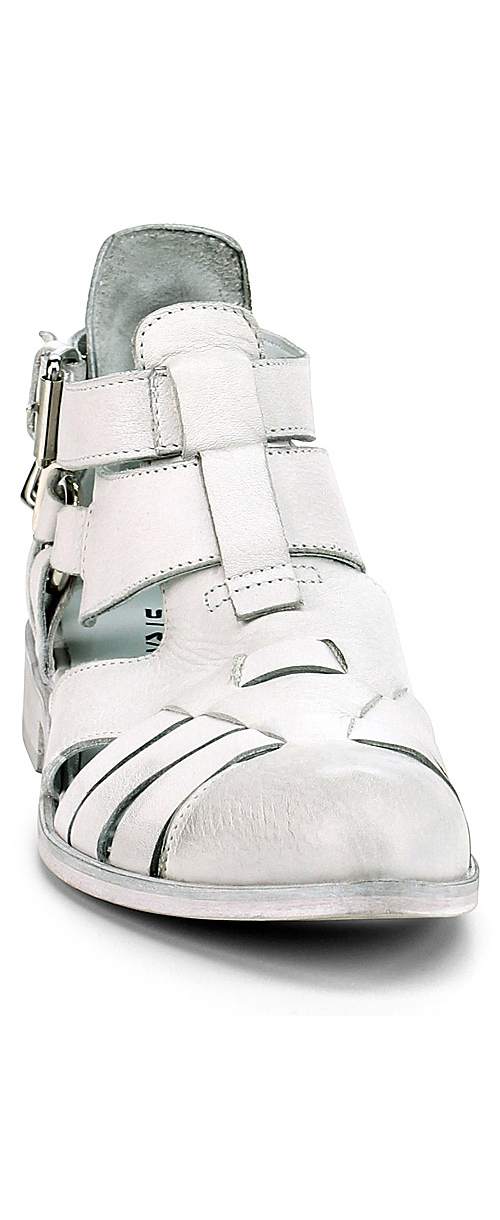 Low shoe in leather with strap with buckle on the outside and metal inserts on the back. Upper with bands and leather sole. Heel 25.