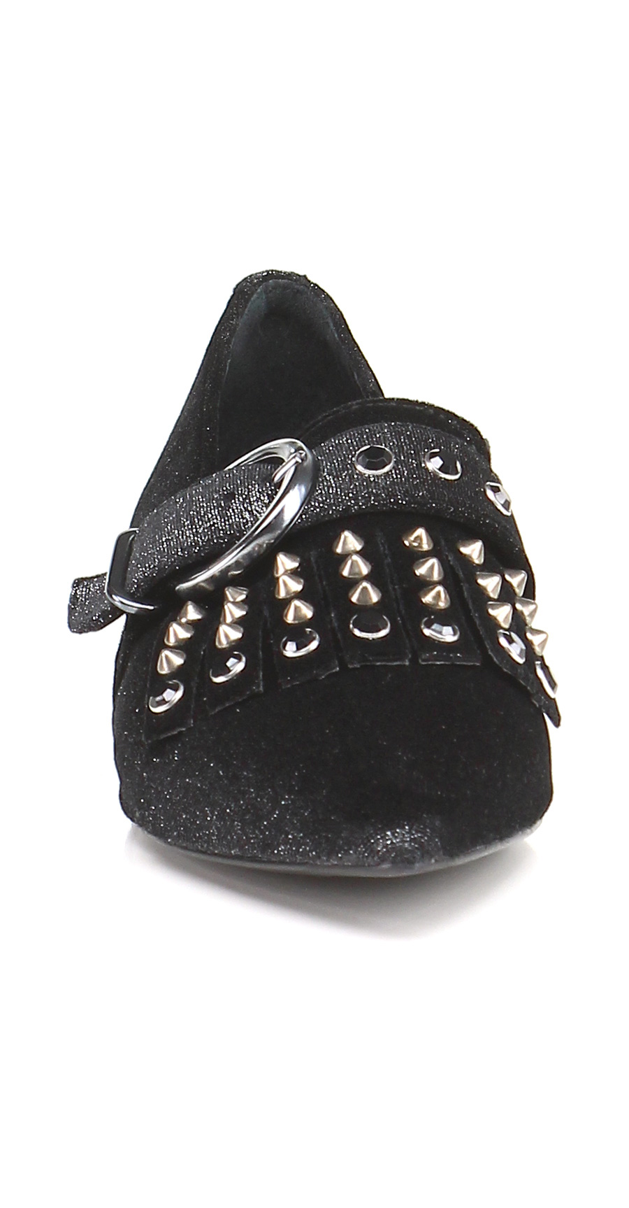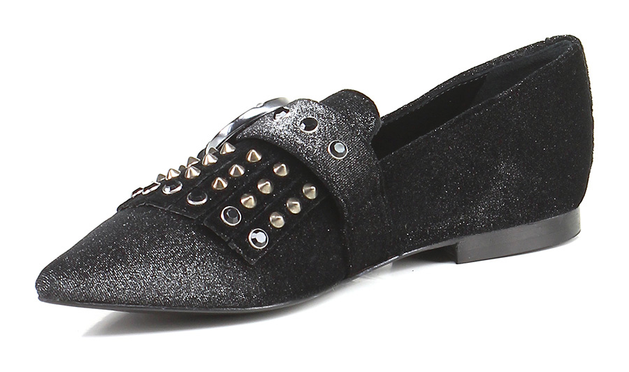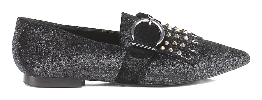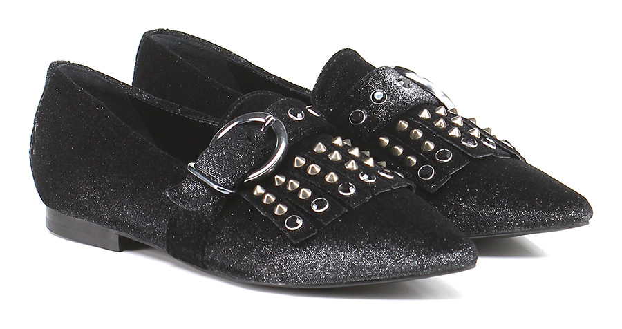 Low shoe in laminated sprayed effect velvet with front strap with rhinestones and fringes with rhinestones and studs. Leather and rubber sole.