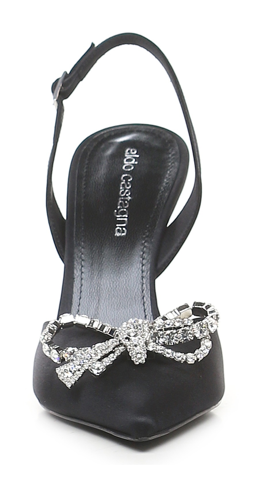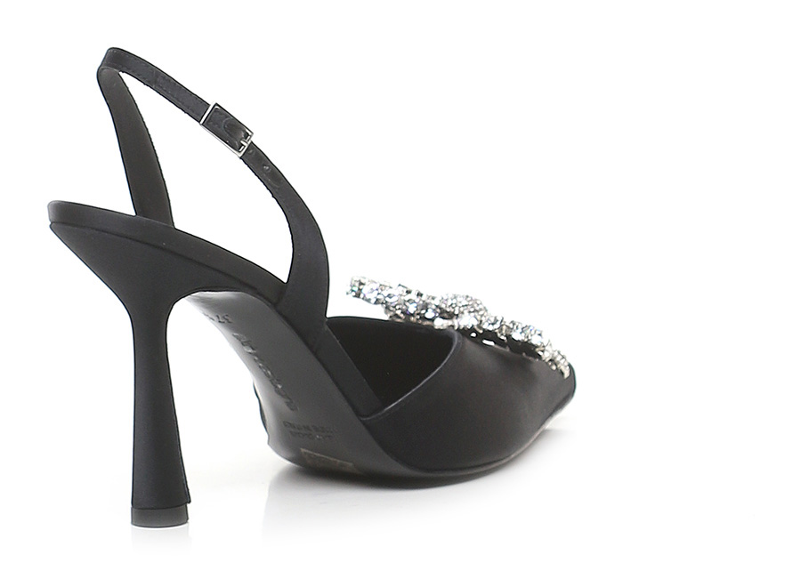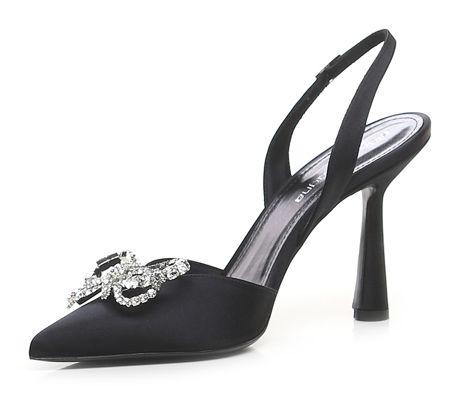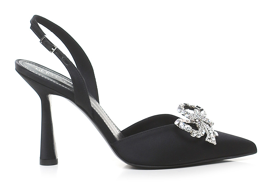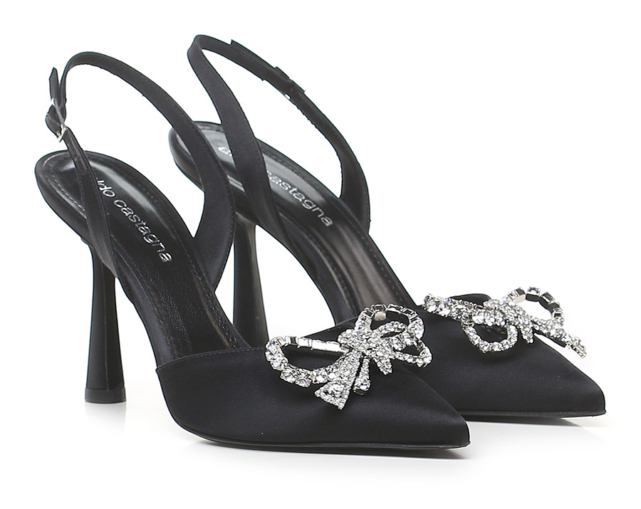 Satin shoe with strap on the back. Bow accessory with front rhinestones. Leather and rubber sole. 100mm heel.