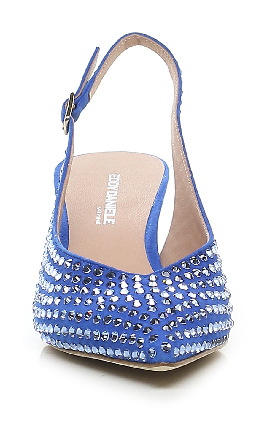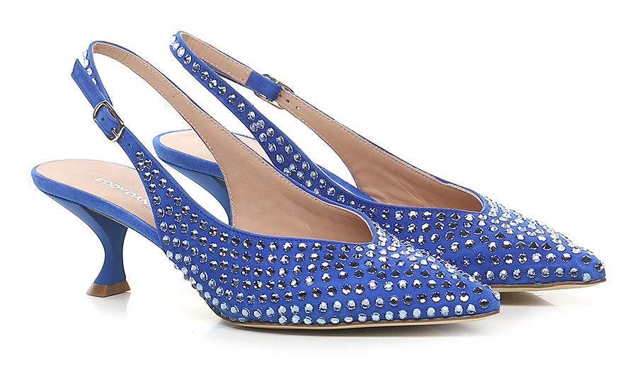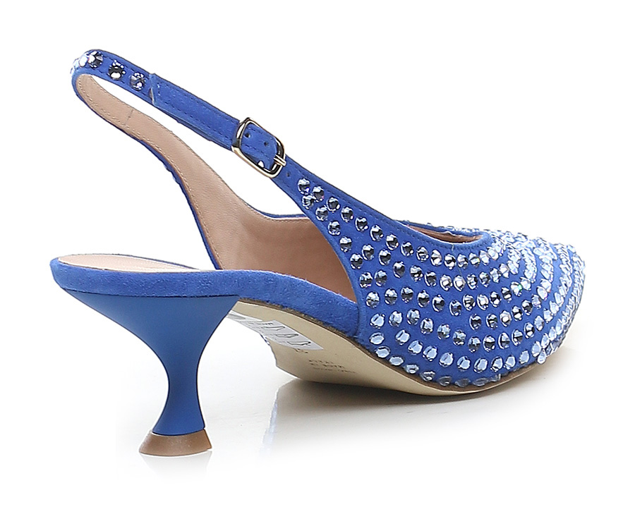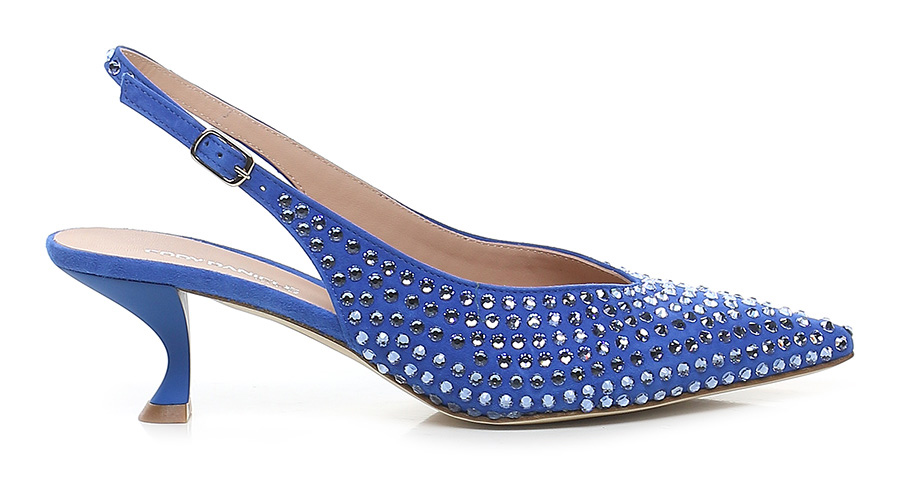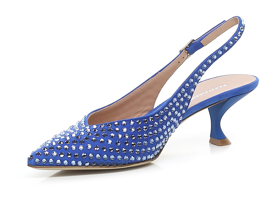 Suede shoe with swarovski. Spool heel in pvc. Leather sole. Heel height 60mm.