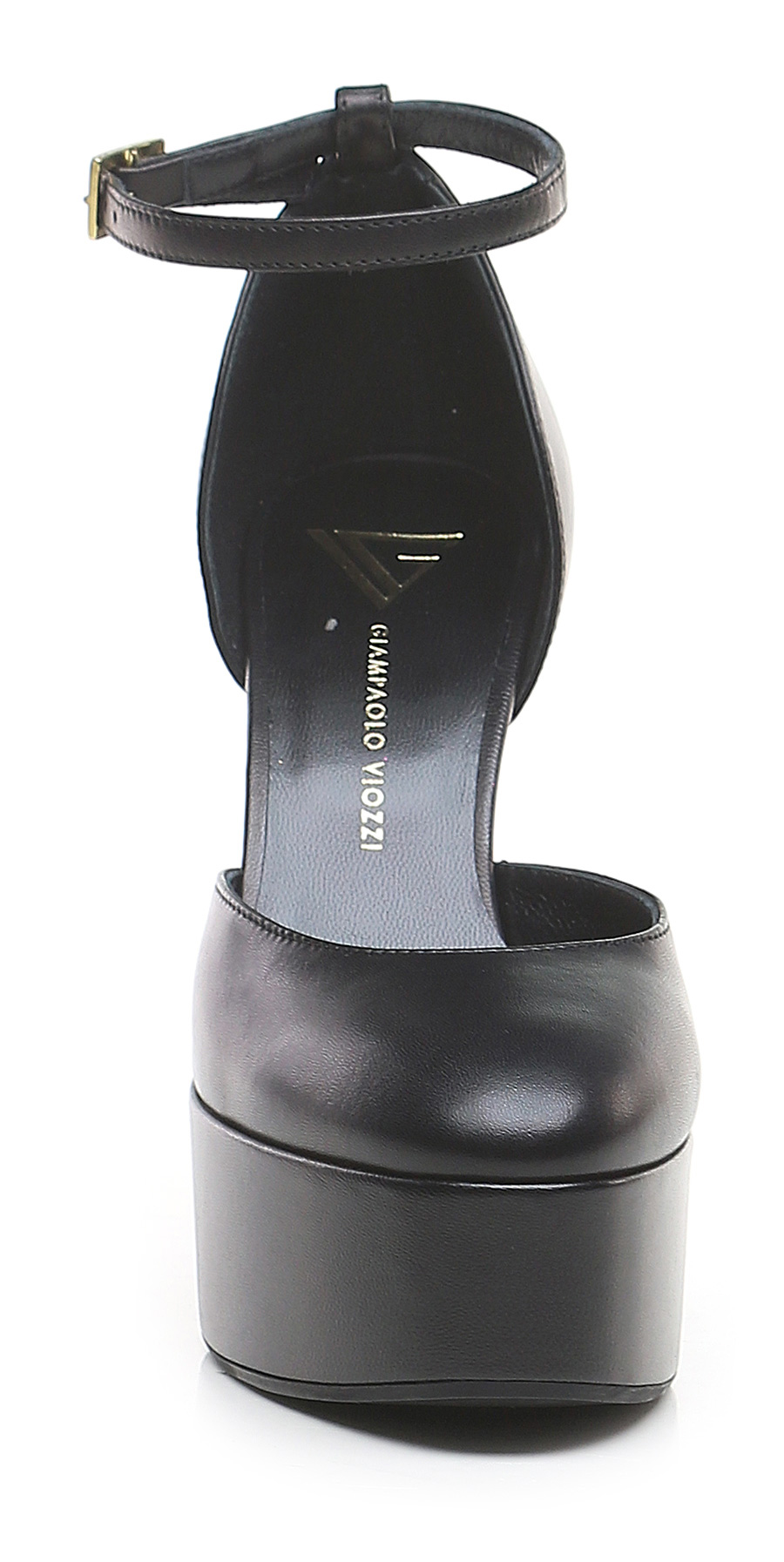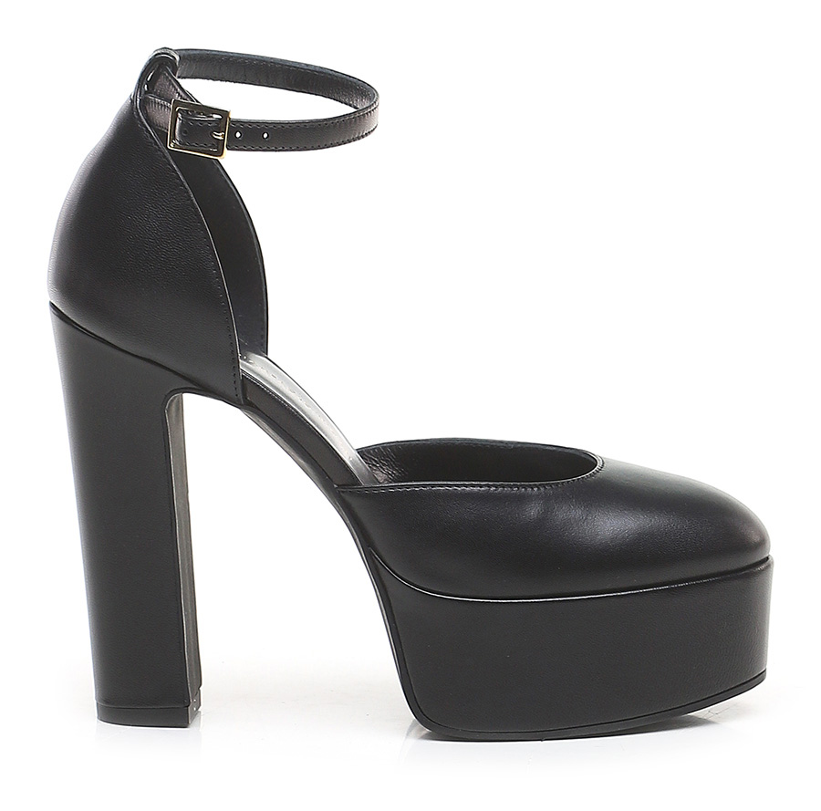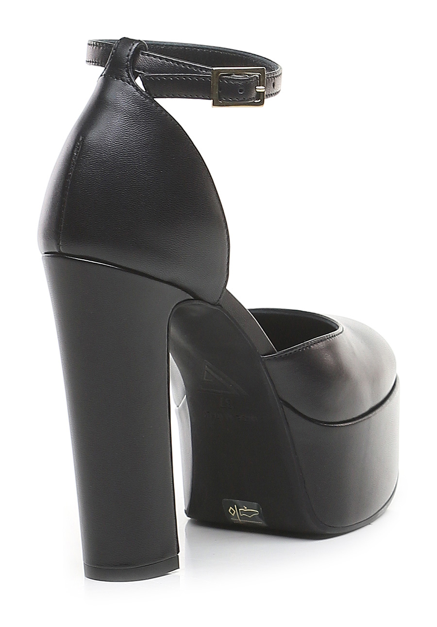Leather shoe with ankle strap and rubber sole. Heel height 130mm, platform 40mm with 90mm ledge.