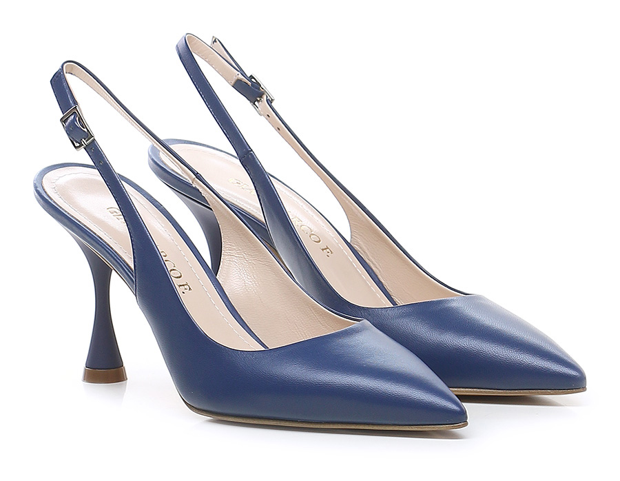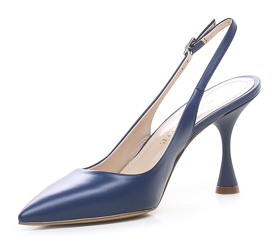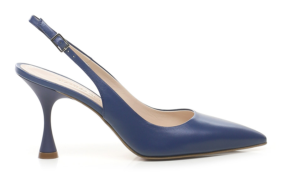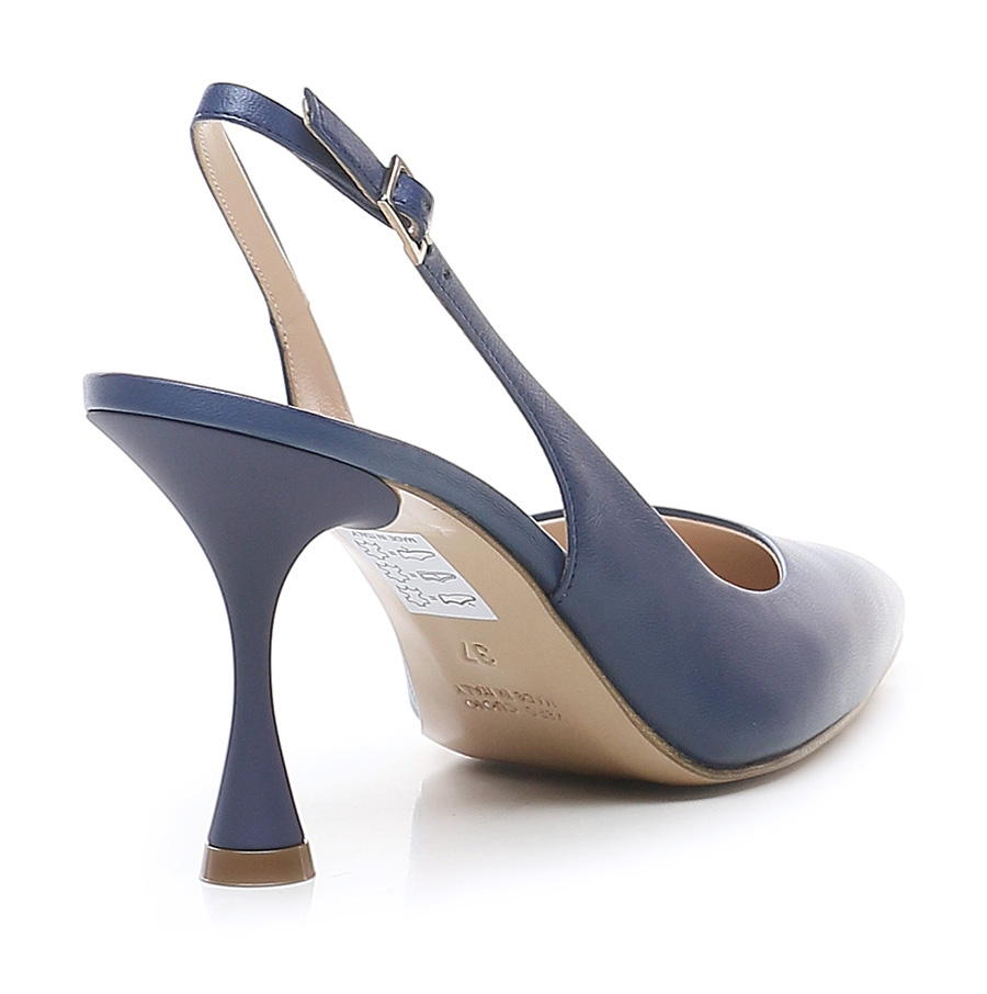 Leather shoe with back strap and leather sole. Heel height 90mm. Matt effect pvc heel.