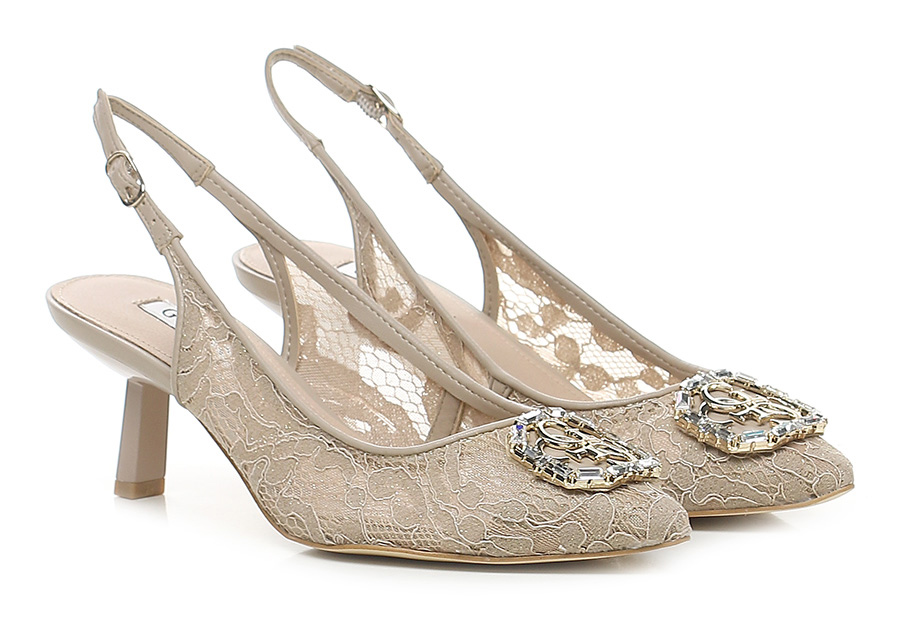 Fabric shoe with imitation leather inserts. Back strap and front application with rhinestones. Rubber sole: 65mm heel height. Matt effect pvc heel.