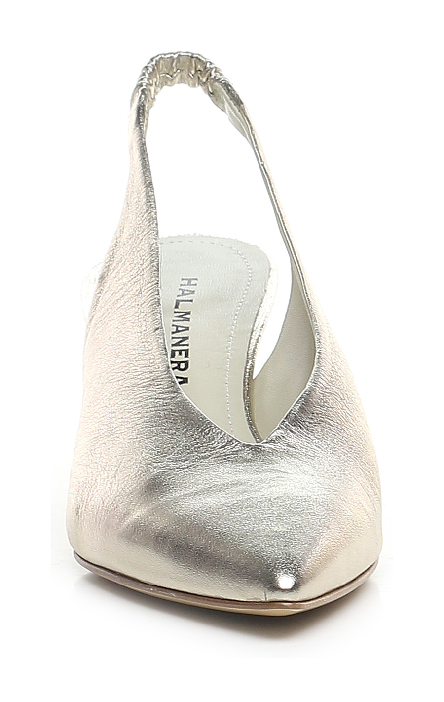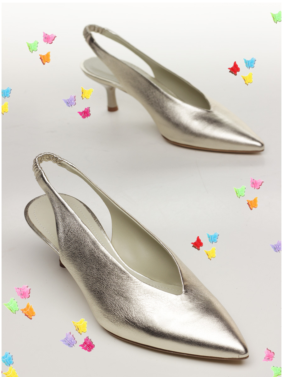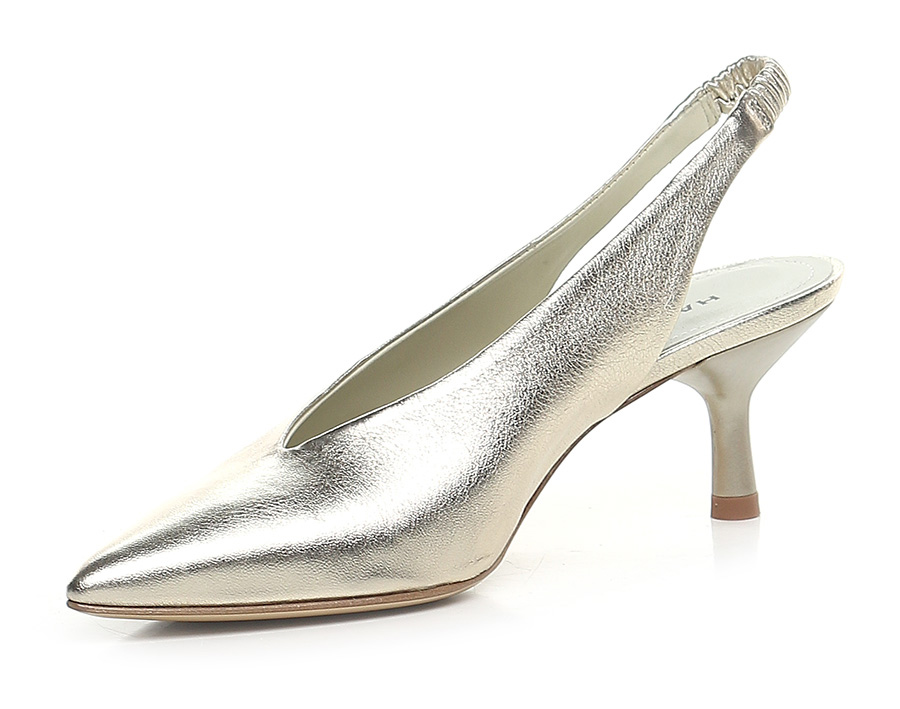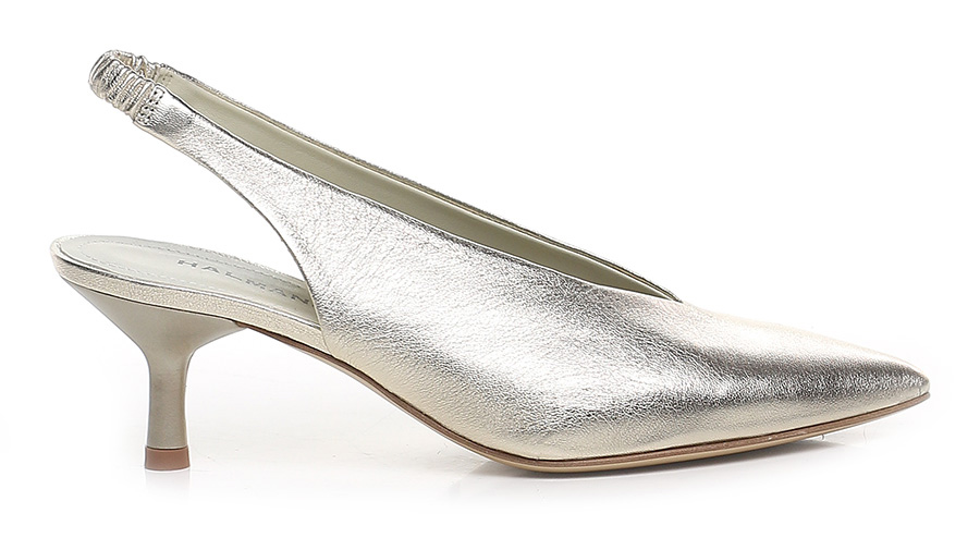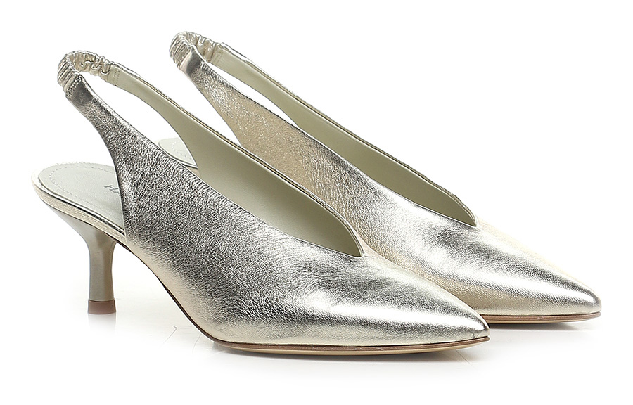 Shoe in laminated leather with elasticated strap on the back. Leather and rubber sole. Heel height 70mm. Leather lined heel.