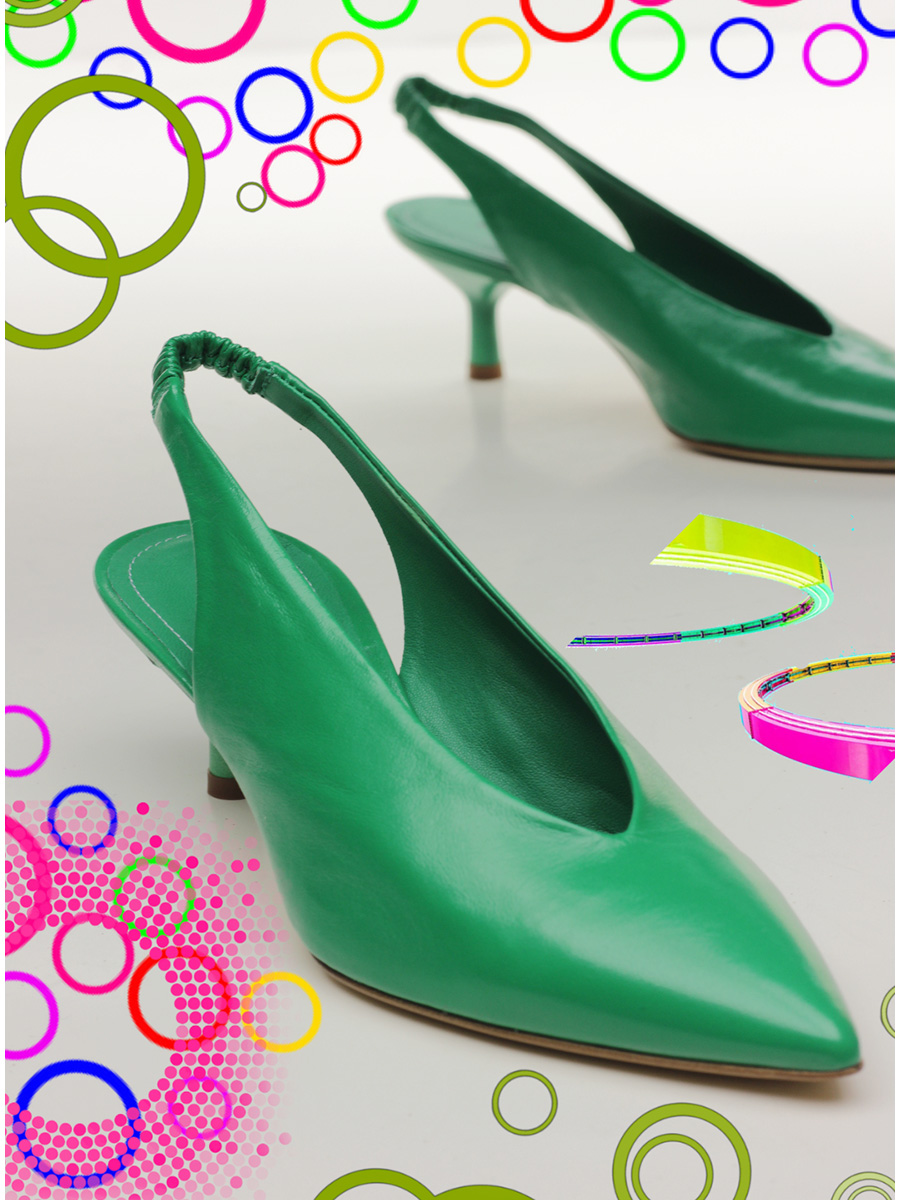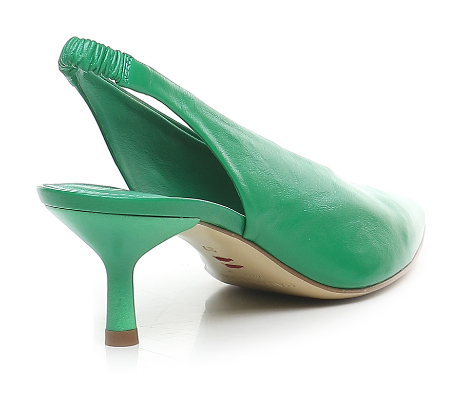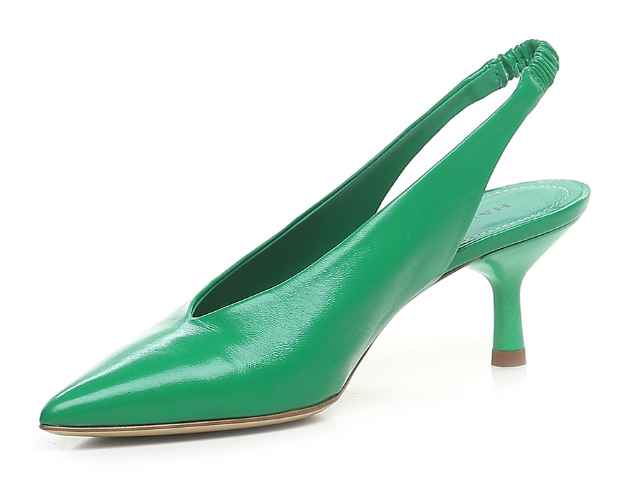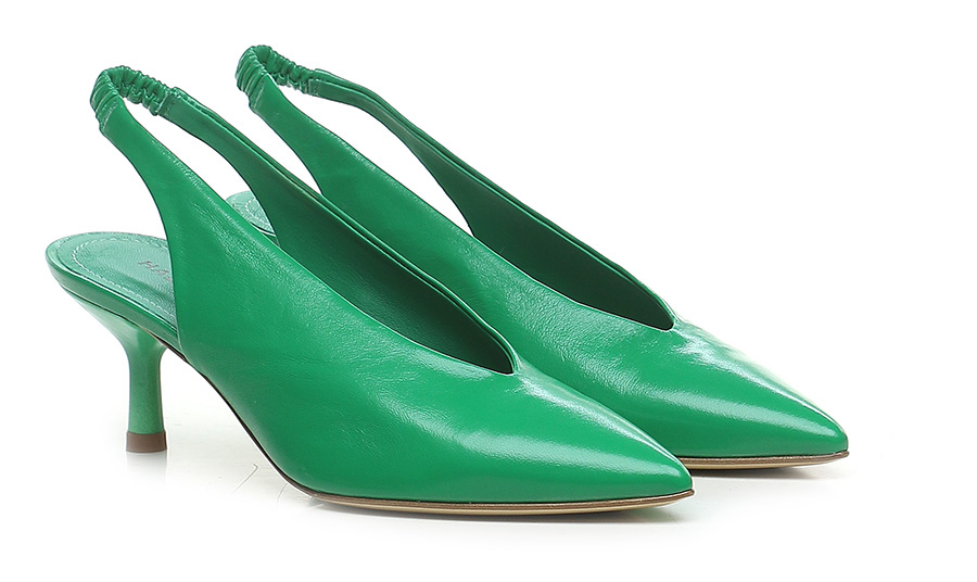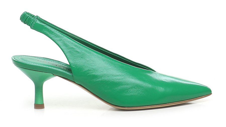 Leather shoe with elasticated strap on the back. Leather and rubber sole. Heel height 70mm. Leather lined heel.