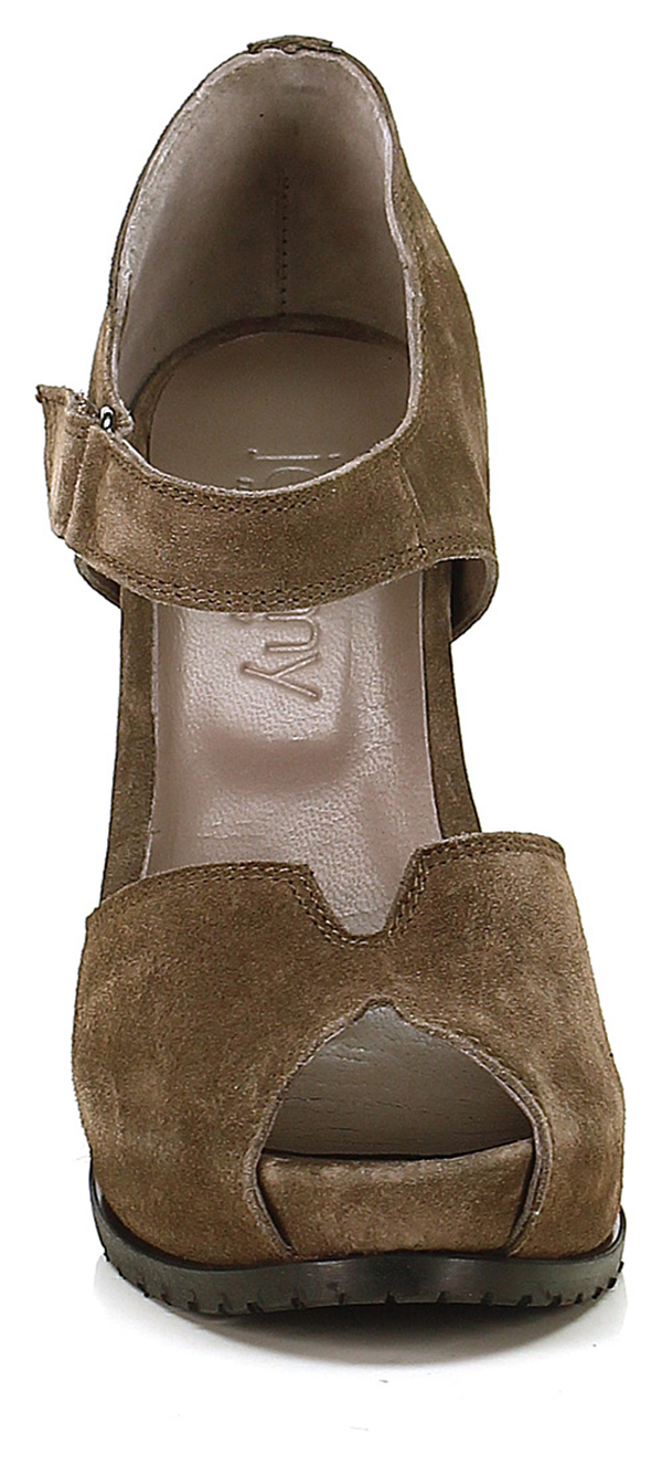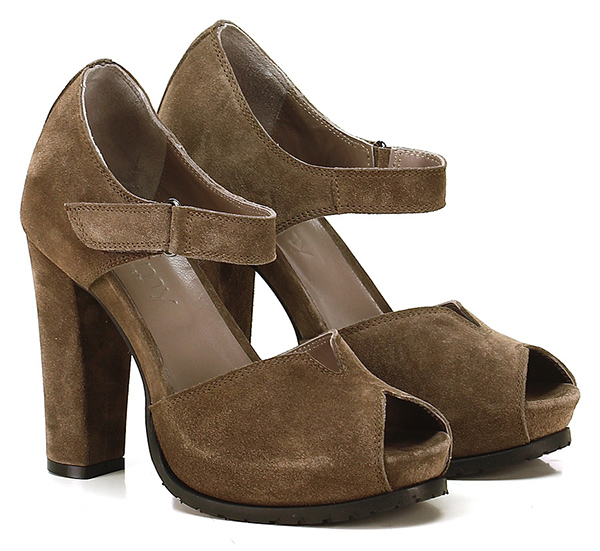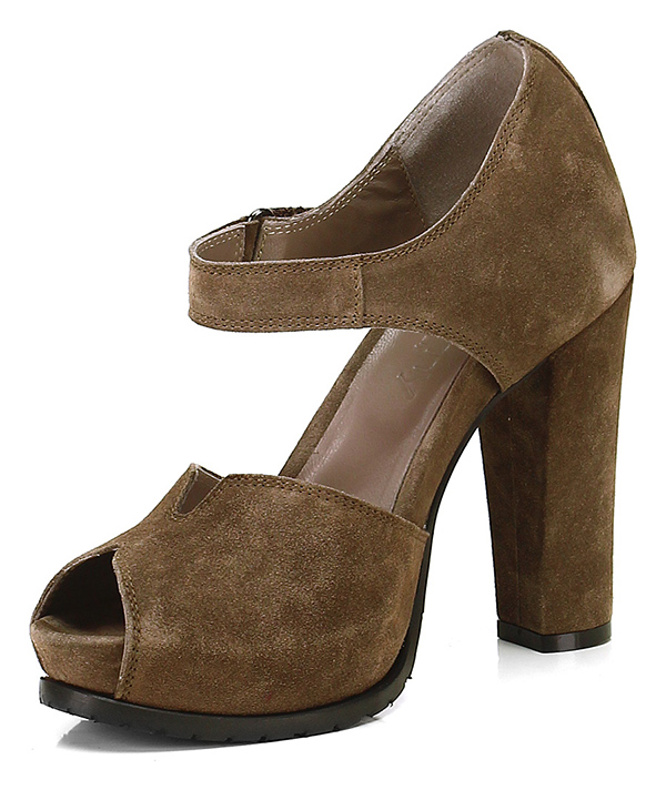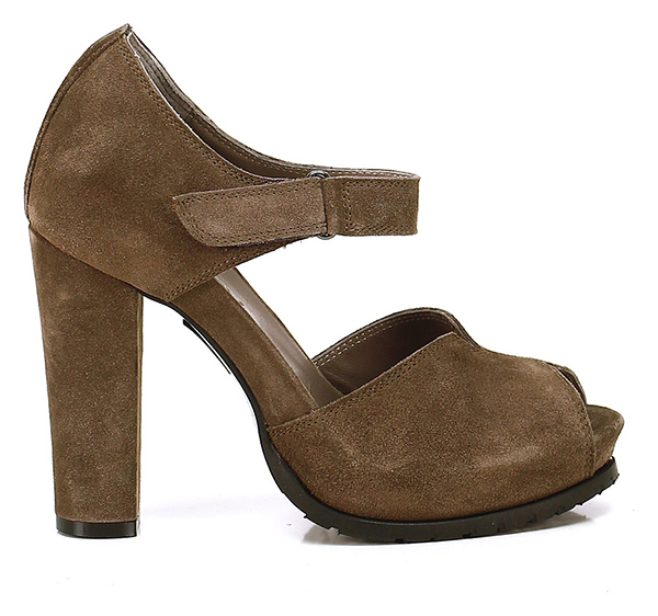 Heeled shoe in textured leather and suede with ankle strap and strap on the outside.