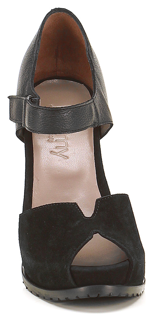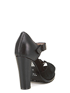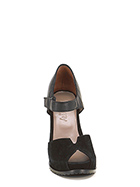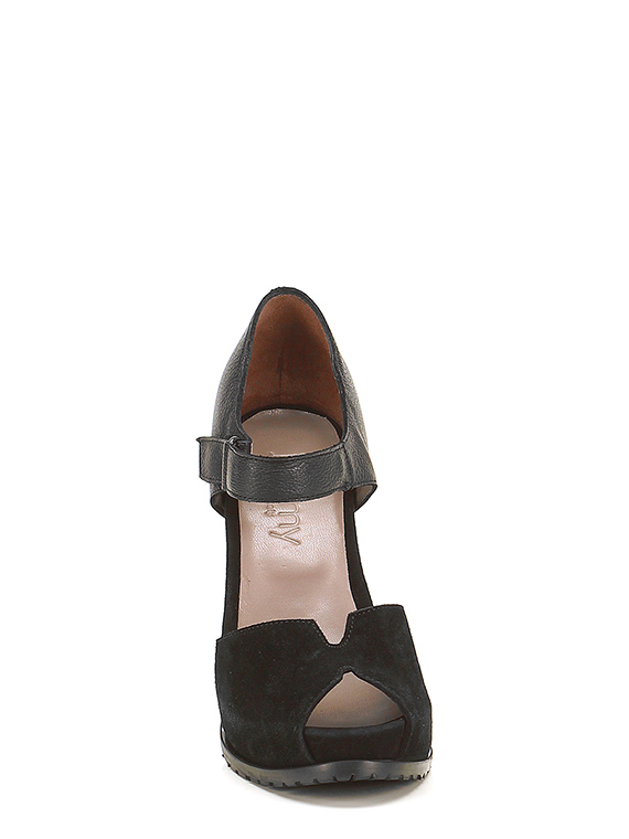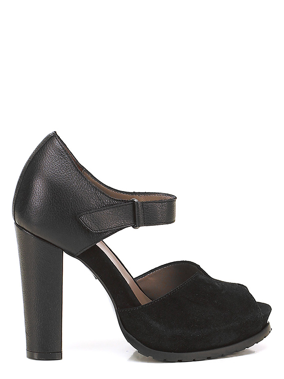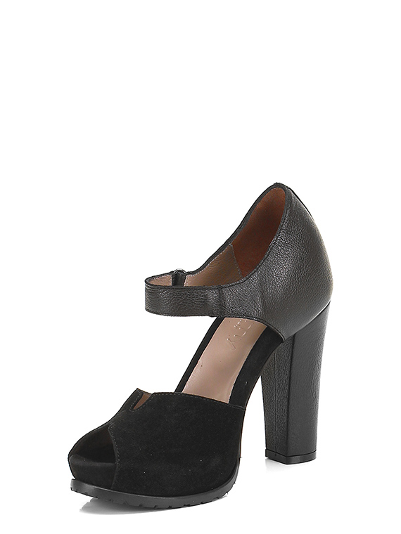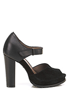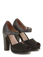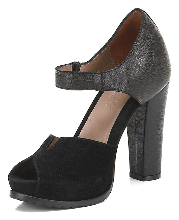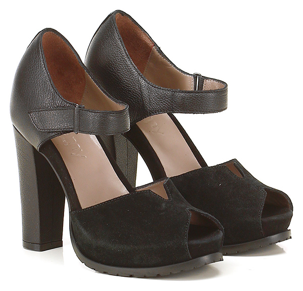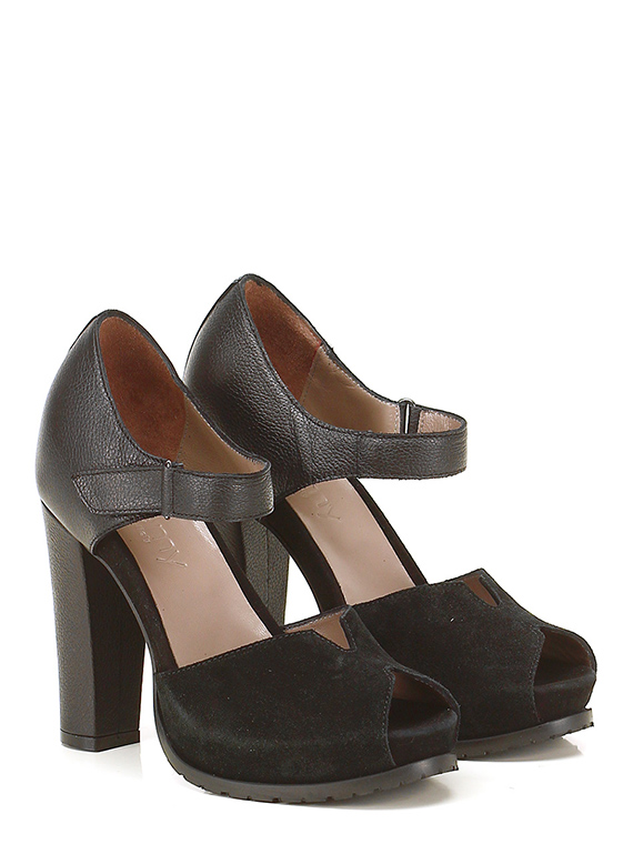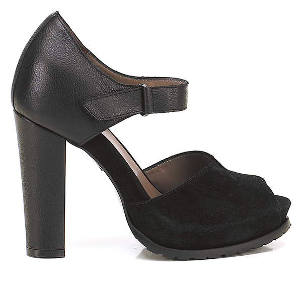 Heeled shoe in textured leather and suede with ankle strap and rubber sole. 110 heel, 30 platform with 80 ledge.