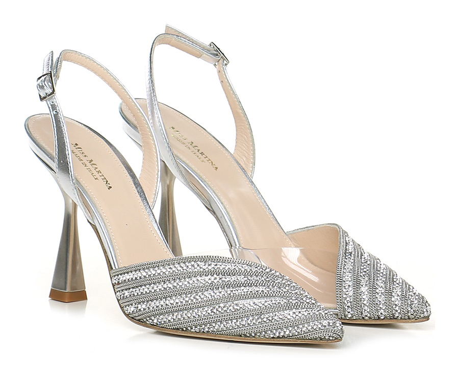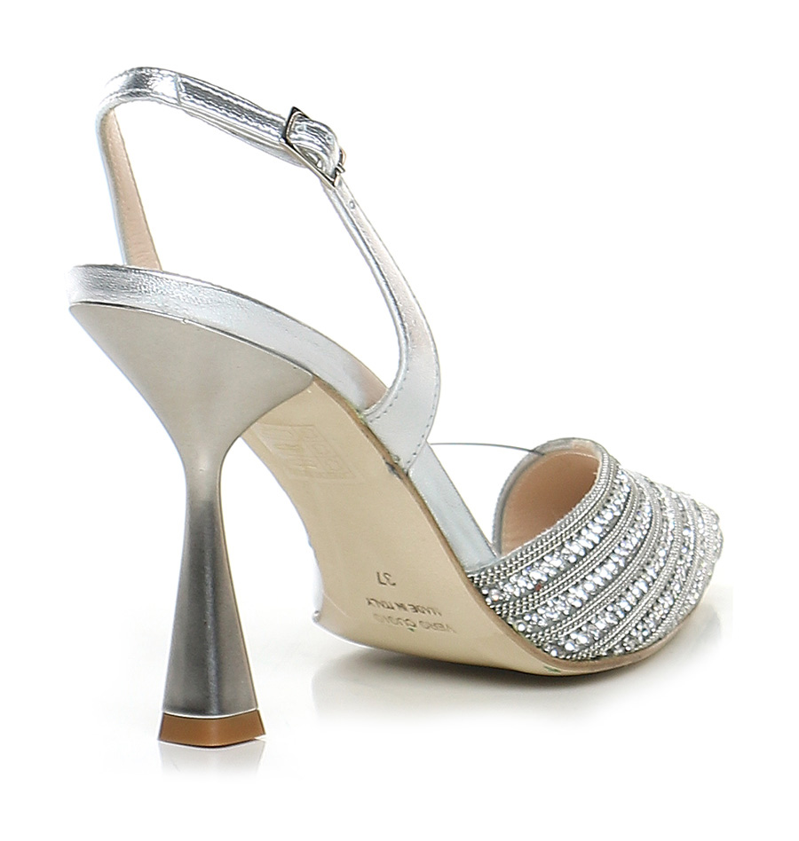 Shoe with heel in laminated leather with inserts in pvc and rhinestones on the upper. Back strap and leather sole. Metal effect spool heel, height: 105mm.