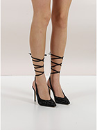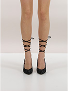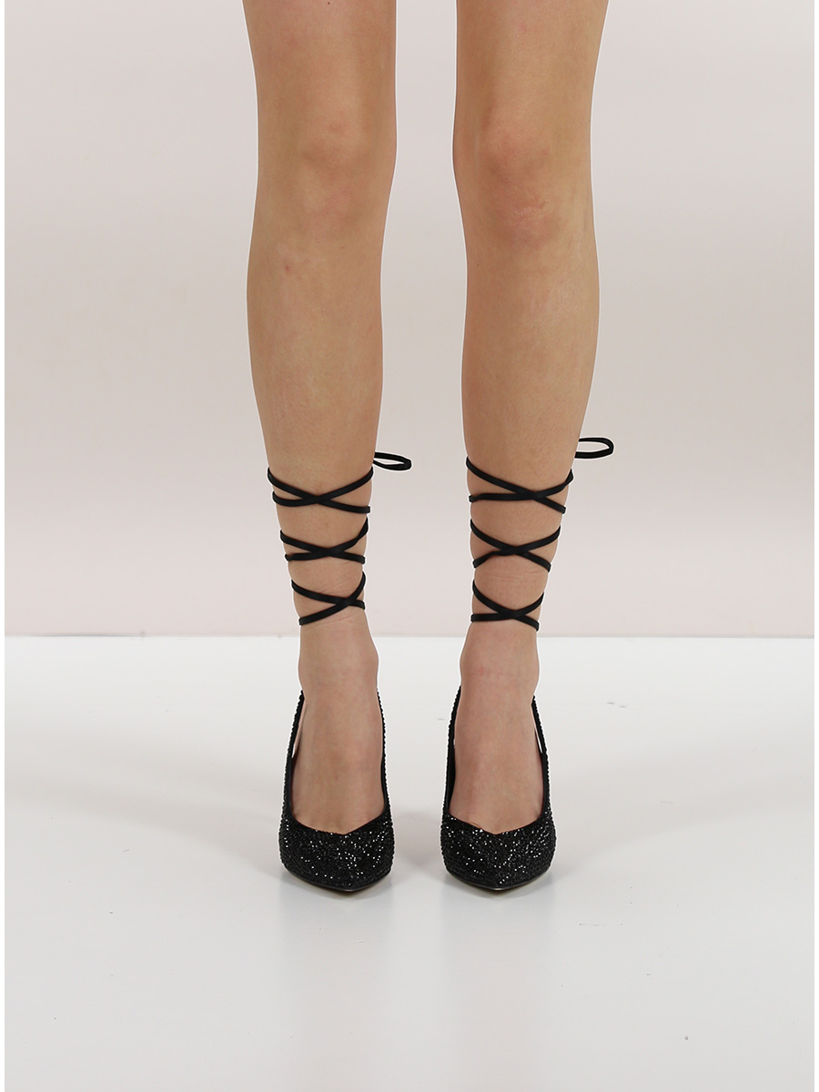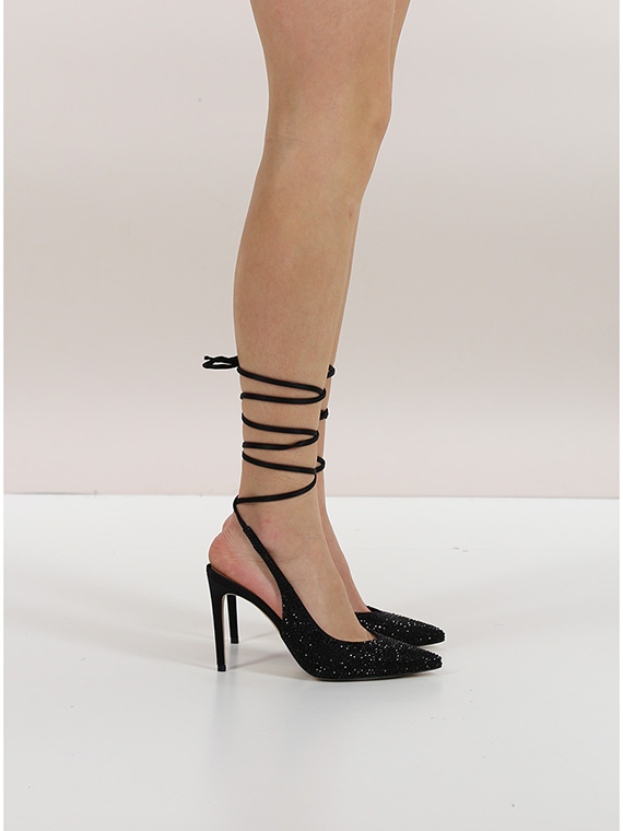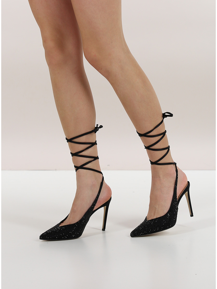 Shoe in satin and rhinestones with ankle fastening. Leather sole. Heel height 105mm.