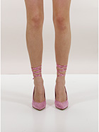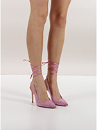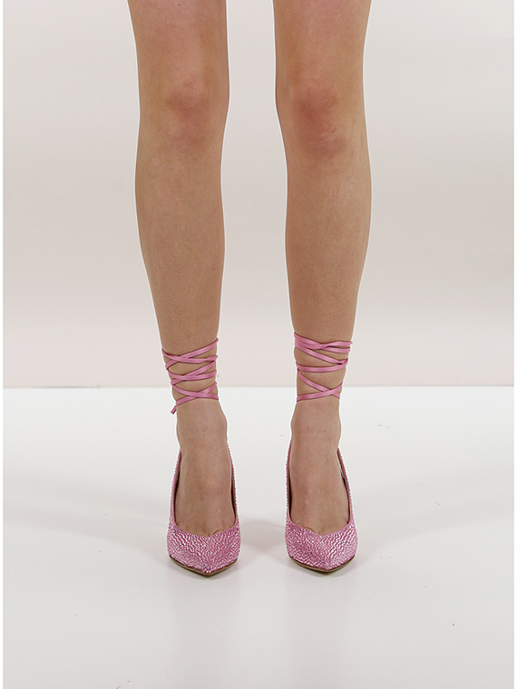 Shoe in satin and rhinestones with ankle fastening. Leather sole. Heel height 105mm.
