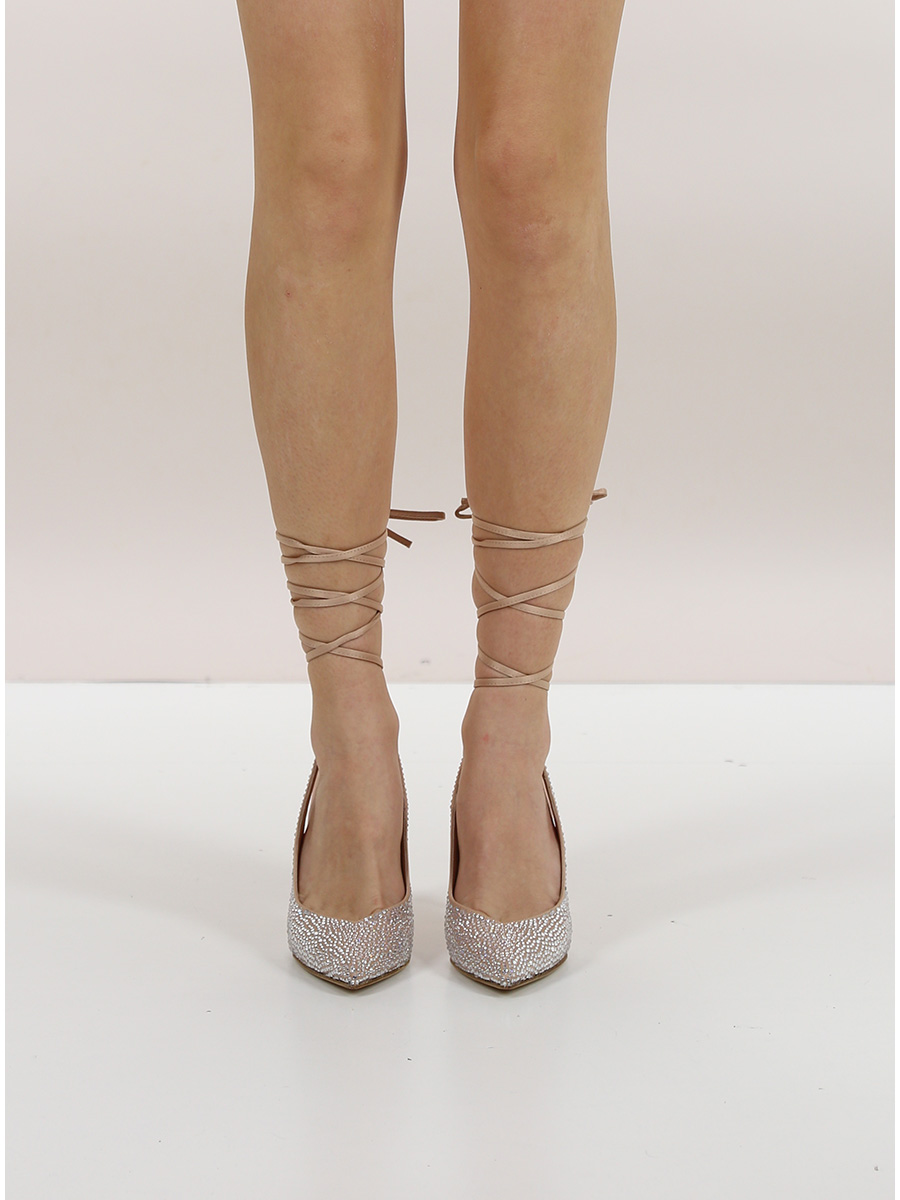 Satin and rhinestone shoe with ankle fastening. Leather sole. Heel height 105mm.