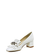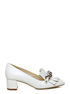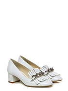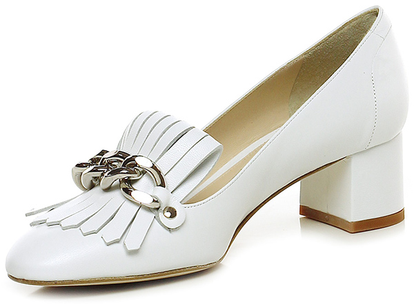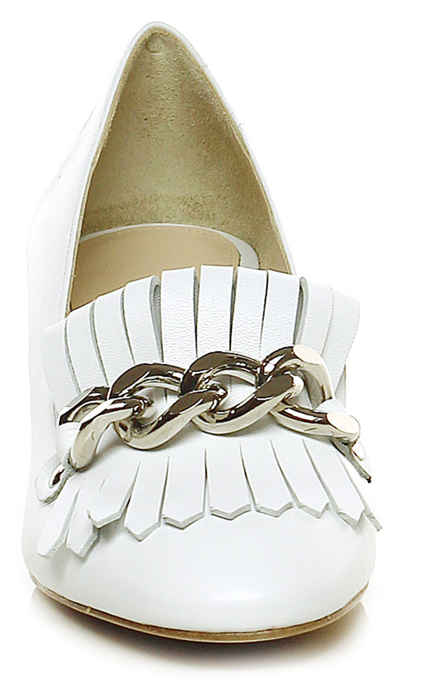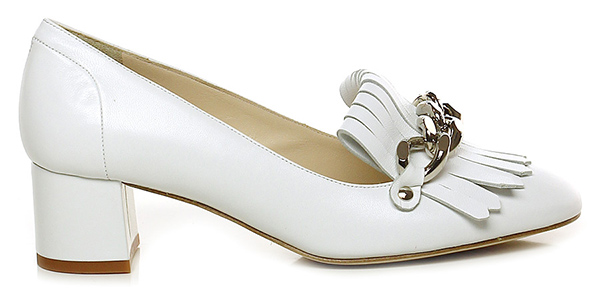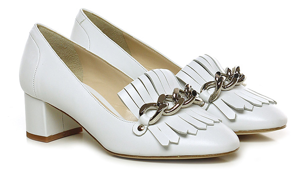 Leather heeled shoe with flap with fringes and front chain with leather sole. Heel 50.